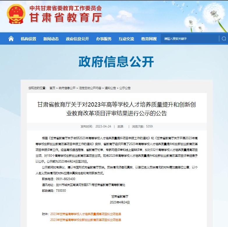 近日,甘肃省教育厅对2023年高等学校人才培养质量提升和创新创业教育改革项目评审结果进行了公示,我院教师王鸿鼎和王潇芹获批两项高等教育教学成果培育项目。
