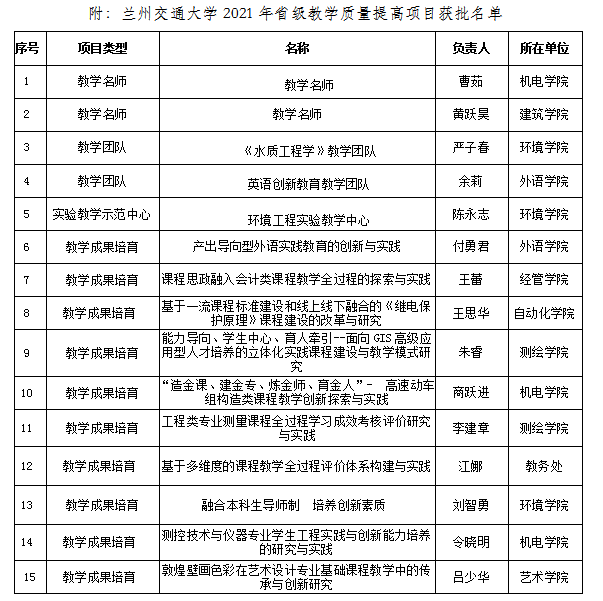 近日,甘肃省教育厅下发了《甘肃省教育厅关于公布2021年高等学校教学质量提高和创新创业教育改革项目的通知》,我院曹茹教授被评为“甘肃省高校教学名师”;“造金课、建金专、炼金师、育金人- 高速动车组构造类课程教学创新探索与实践”和“测控技术与仪器专业学生工程实践与创新能力培养的研究与实践”2项项目被评为“高等教育教学成果培育项目”。