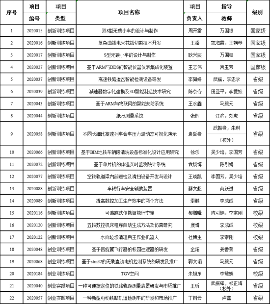 经学生申报,学院推荐、学校专家评审等环节,2020年我院共22个项目获得“大学生创新创业训练计划”项目立项,其中创新训练类项目17项,创业训练类项目3项,创业实践类项目2项。同时,22个资助项目中,4项被推荐为国家级项目,14项被推荐省级项目。获批项目名单如下: