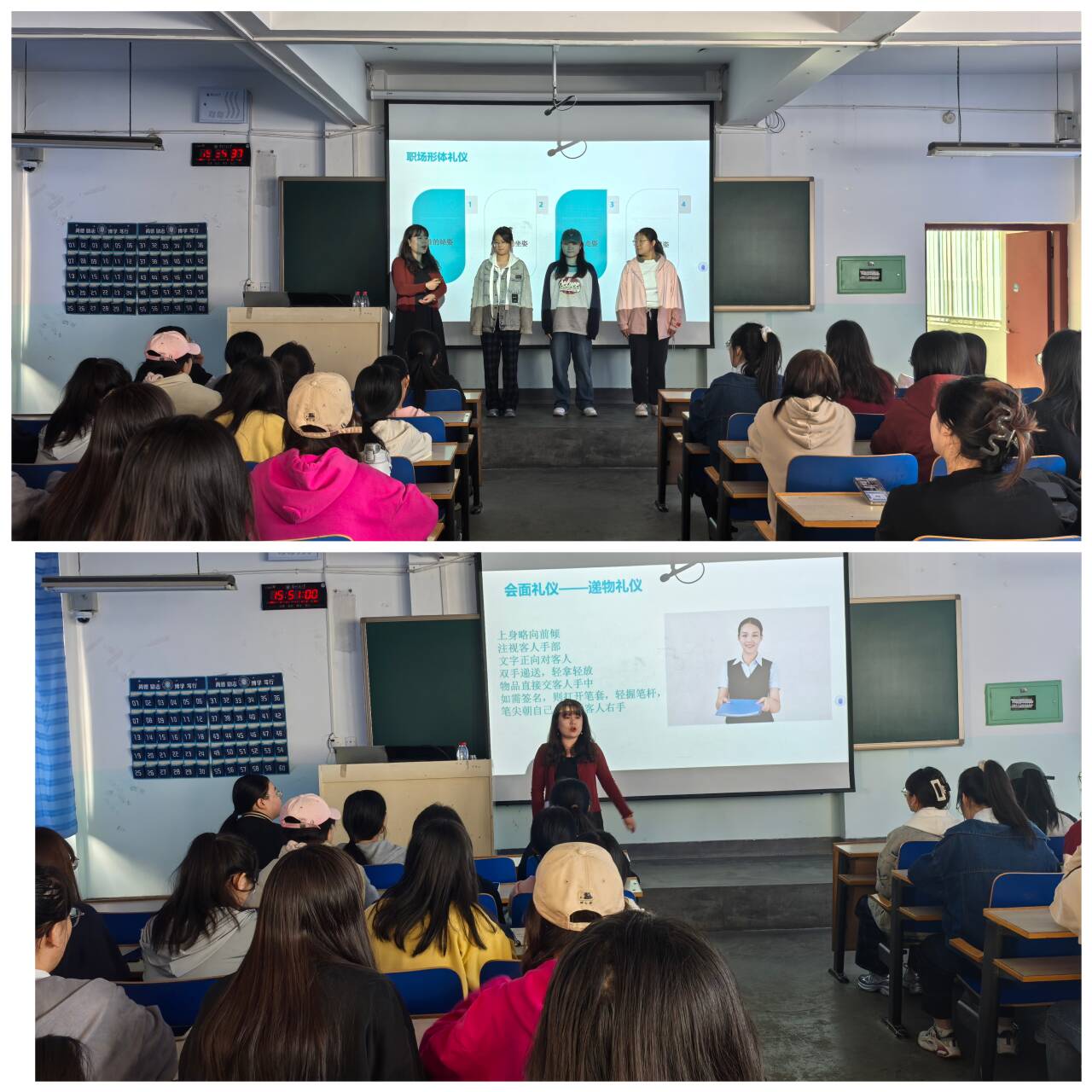 学工办主任张晓丽以求职者的视角为切入点,深入剖析了女大学生群体在求职过程中所面临的困境、压力及其心理状态,围绕自我认知、环境分析、职业定位、未来规划等方面进行了详细的讲解和指导。同时,就形象仪态、语言表达、着装穿戴等方面对女生们进行了就业礼仪培训,帮助女生以良好的状态面对就业挑战。张老师建议同学们要明确自己的求职定位和方向,紧跟当前就业形势,结合自身专业特点,找到实现稳定就业的路径;鼓励女生要勇于直视自己的优势与劣势,积极面对困难与挑战,突破来自内心和外界的限制,不断通过不断地学习来提升自身专业能力和综合素养,提升自我认知的深度与广度,增强就业竞争力。