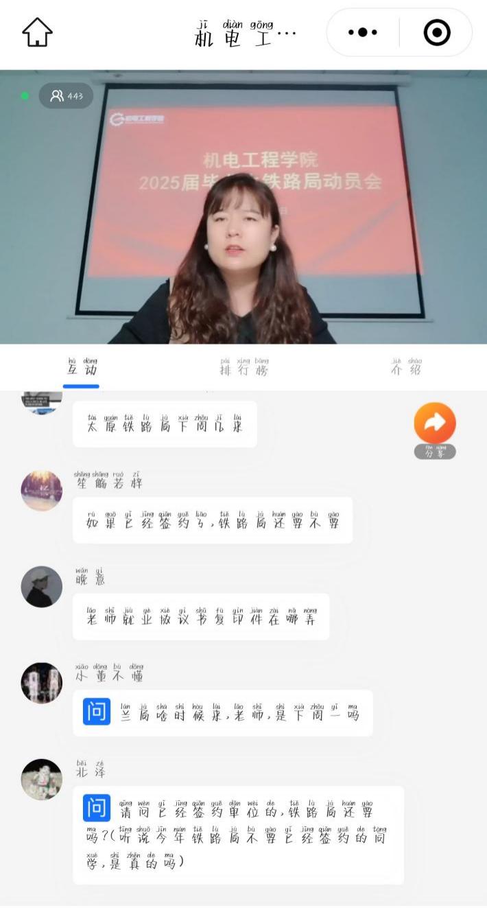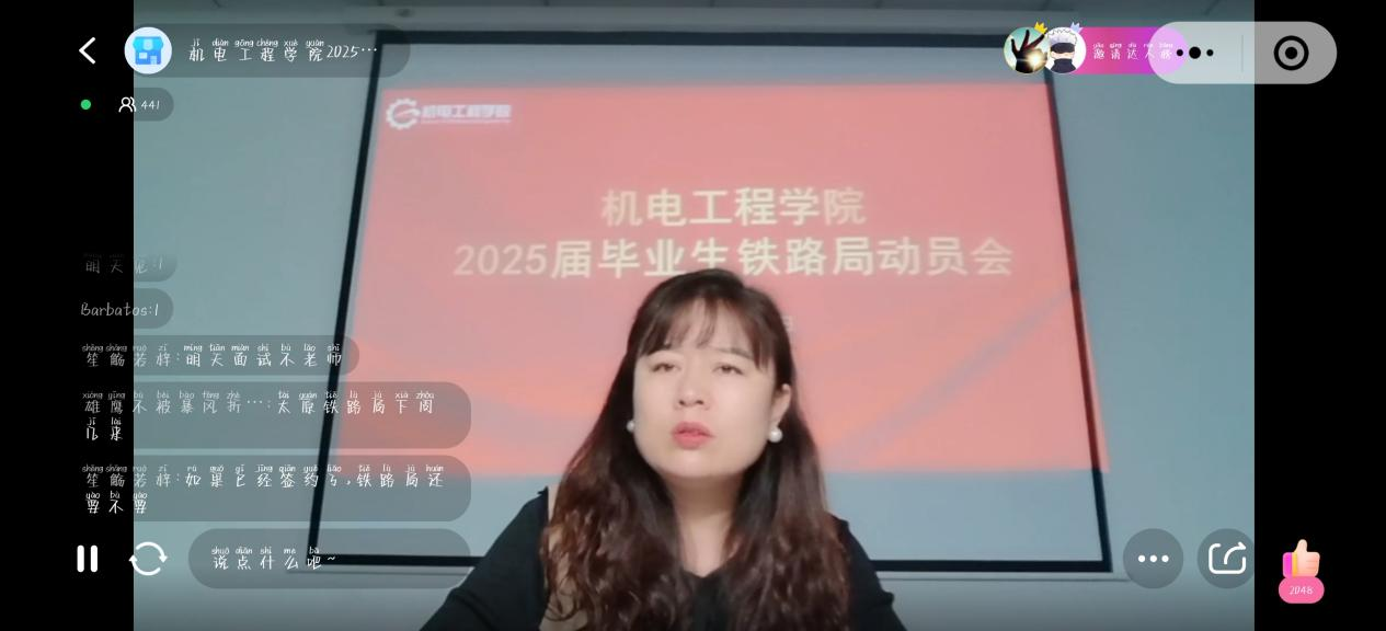 为扎实做好学院2025届毕业生就业指导与服务工作,增强毕业生对目前就业形势和政策的了解,激发毕业生求职热情,推动毕业生高质量就业,11月7日晚上7:00,学院通过小鹅通平台召开了2025届毕业生铁路局就业动员会,辅导员李亚娜、全体毕业生参加了会议,会议由学生工作办公室主任张晓丽主持。