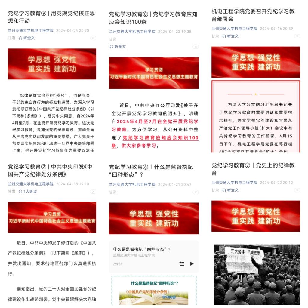 学院党委为全院师生党员配发《条例》电子书籍,通过学院网站、微信公众号等平台推送理论文章、专家解读等内容,为个人理论学习提供良好条件。引导广大师生党员把自主学习作为一种工作责任,一种精神追求,学在日常,落在实处。用党规党纪校正思想和行动,真正使学习党纪的过程成为增强纪律意识、提高党性修养的过程。截止目前,学院党委共计组织理论中心组学习2次,各支部学习活动60余次。