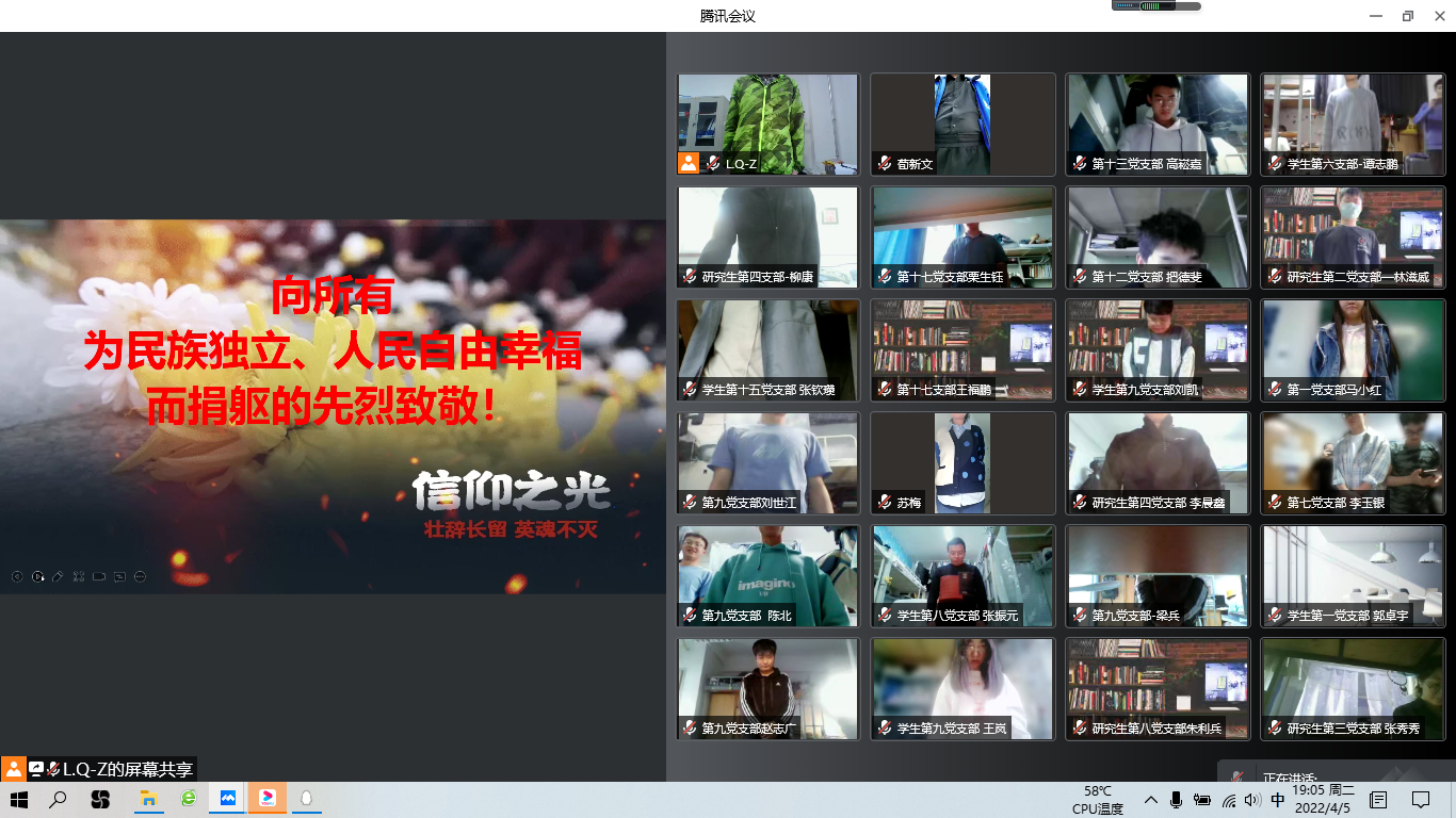 晚上7:00,主持人宣读全体起立,向所有为民族独立、人民自由幸福而捐躯的先烈致敬!党员们肃立默哀,慎终追远,寄托哀思,表达对革命先烈的敬仰和追思,以简约朴素的方式缅怀先烈的丰功伟绩。