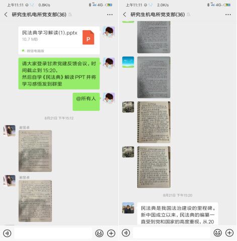 党委理论学习中心组率先学习,学习坚持主体平等、保护财产权利、便利交易流转、维护人格尊严、促进家庭和谐、追究侵权责任等民法典一系列新规定新概念新精神,每位党委委员都针对日常生活实际发表了自己的看法和观点,都表示要切实推动民法典实施,以更好推进全面依法治国、建设社会主义法治国家,更好保障人民权益。机设系教工党支部在陇政钉以视频会议的形式进行了主题党日活动,集体学习《民法典》。全体党员首先观看了学习强国视频“民法典开讲”第一讲《民法典的时代精神与中国特色》,听中国人民大学常务副校长王利明教授解读《民法典》的时代精神与中国特色,了解了民法典产生的背景、意义和重要性,随后大家就民法典的颁布展开了热烈的讨论。研究生第十三党支部组织全体党员,线上学习实施民法典的立法背景、立法过程、具体篇章内容和重大意义,支部要求全体党员务必认真学习,更好的借助法律武器维权。本科生第四党支部,针对民法典的颁发,组织专题学习,并在会后举办征文比赛,针对民法典的章节、意义并结合实际发表自己的感悟和想法。其他党支部也通过多种方式进行专题学习。