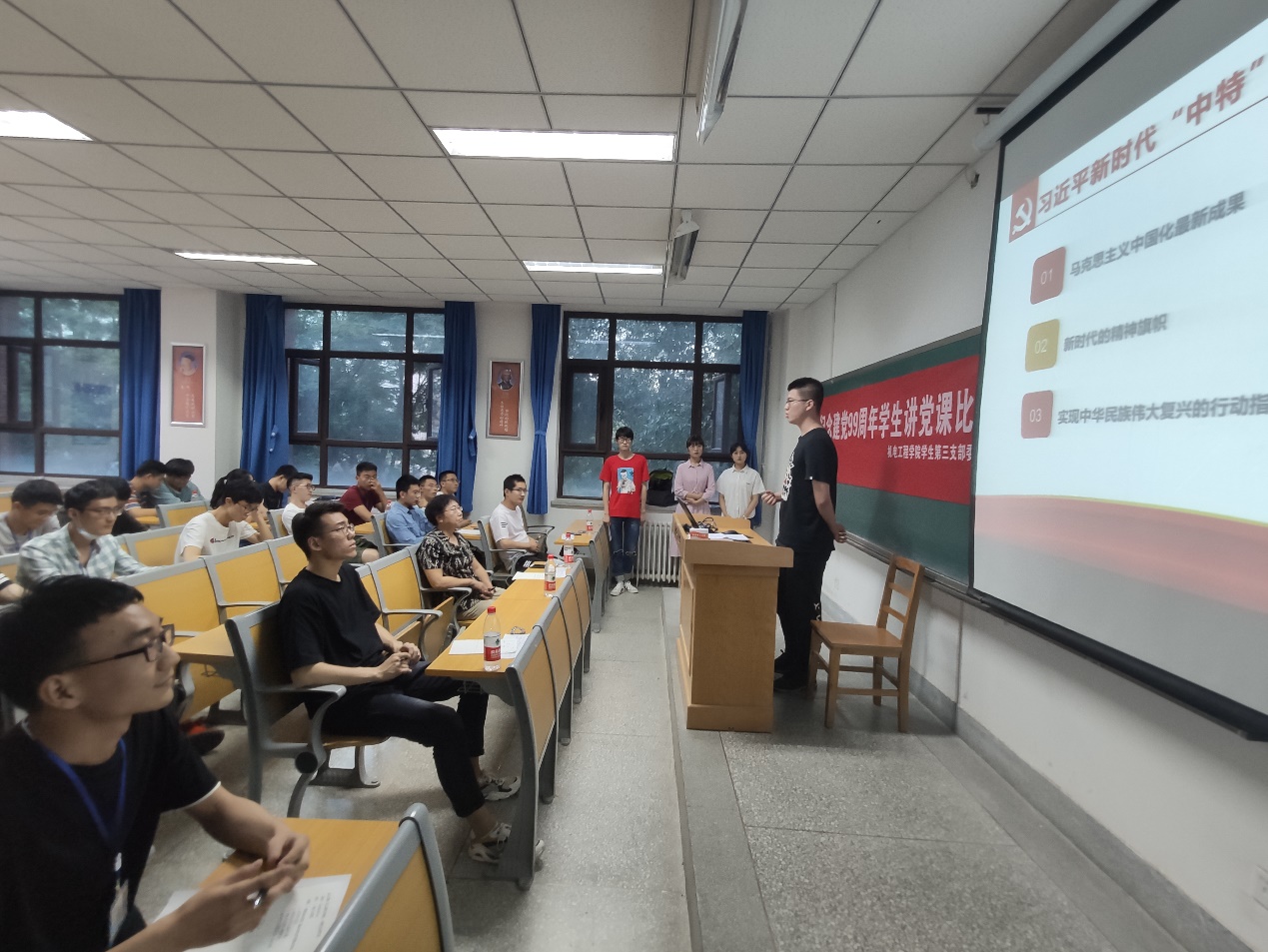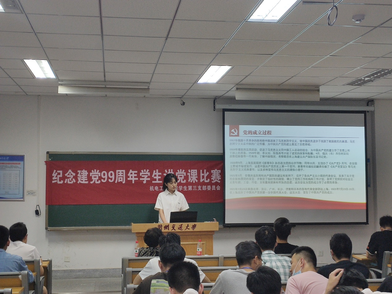 今年是中国共产党成立99周年,为进一步激励和引导支部师生党员紧密团结在以习近平同志为核心的党中央周围,不忘初心、牢记使命,深入学习我党99年的奋斗史、新中国成立以来的发展史,自觉弘扬共产党人的崇高精神和价值追求,6月23日晚上七点,机电工程学院学生第三支部在二教305教室开展了主题为“纪念建党99周年——支部党员讲党课”活动,支部全体成员均到场参加了活动。活动由党支部副书记王亚正主持。