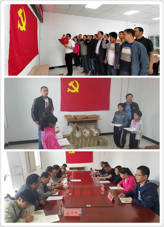 活动中,芦子沟村第一书记宣读了康乐县开展五联活动的通知文件,包村组长李学卿同志带领全体党员学习了《习近平扶贫论述摘编》部分内容,村党支部书记汇报了基层党建基本情况和当前重要工作。接着,机电工程学院党委组织员传达了习近平总书记在“不忘初心、牢记使命”主题教育工作会议上的讲话精神,同时,就学院党委开展党支部标准化建设的情况以及党建工作特色进行了说明。随后,机电学院副院长杨晋同志强调了在当前脱贫攻坚工作形势下开展“五联”活动的意义,并代表机电工程学院向芦子沟村小学捐赠了小学生学习物品,包括1500本作业本、打印纸等办公用品。他指出扶贫要与扶志、扶智相结合,鼓励孩子们努力学习,用知识改变命运,做对社会有用的人才。最后,八丹乡相关领导做了总结发言,他说芦子沟村十分重视交大驻村队员的生活条件,在资金十分紧张的情况下设置了食堂,解决了驻村队员的吃饭问题;驻村队员积极开展入户工作,切实了解群众疾苦,帮助解决群众实际问题;驻村工作管理机制完善,形成了特色鲜明的“三纵三横”工作体系,包村干部、村干部与驻村队员相互协调,推进各项工作向前发展。活动结束后,全体党员面向党旗集体宣誓,重温入党誓词,在铮铮誓言中,党员们重新经受了一次党的洗礼,接受了党性再教育,体现了在脱贫攻坚的时代背景下不忘初心、牢记使命的决心与担当。