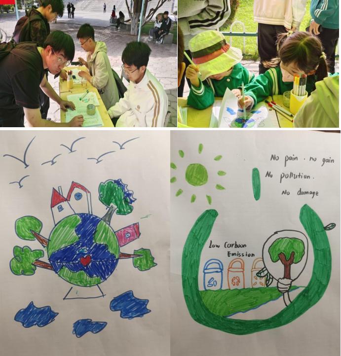 活动现场,青年志愿者积极向同学们宣传环保知识,传递环保意识,引导同学们通过艺术的形式表达对大自然的热爱与对环保事业的美好愿景。画笔在手,心绪飞扬,一幅幅色彩斑斓,线条流畅的画作中,展现出的是同学们对环保事业的深刻理解和独特见解。“蔚蓝的海洋中游弋的海豚和五彩斑斓的珊瑚”,寓意着我们应当保护海洋生态环境;“绿树成荫、鸟语花香的田园风光“,表达的是对自然生态的热爱与呵护;“城市中繁忙的街道、高楼大厦与巍峨的电线杆”,引发的是人们对城市环境的反思和关注……每一幅作品都饱含着同学们对环保的热情和对美好未来的向往,足以让人感受到他们心中对地球的热爱和呵护之情。最终,活动在一幅幅绚丽缤纷的画作中圆满落下帷幕,欢声笑语始终回荡在鸽子广场,给每一位参与者留下了一份浓墨重彩的回忆。