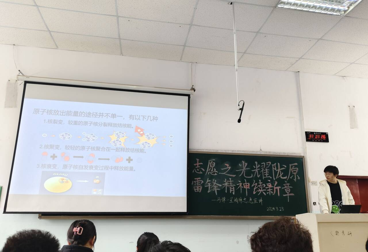 活动期间,三位宣讲人对我国核能事业的发展进行了全面深入的介绍,涵盖了其在能源、科研和医疗等领域的重要应用,凸显了核能清洁低碳、安全高效的价值;聚焦为中国核事业作出杰出贡献的科学家们为了国家和人民的福祉,甘愿牺牲个人的时间和家庭,追求科学真理、追求科技进步的奋斗历史和英雄事迹,引导同学们深入理解科学家们崇高的奉献精神和浓厚的爱国情怀;通过图片展示和内容讲解,向同学们讲述了中国第一颗原子弹、导弹核武器、氢弹、人造地球卫星的研发过程,引导同学们领悟研制科技成果的艰辛历程,以及“两弹一星”精神的现实意义;同时,也实事求是地探讨了核能带来的潜在危害,强调了安全管理与污染防治的重要性,提醒同学们关注核能安全,树立科学防范意识。与会同学纷纷表示,深刻体会到了老一辈科学家的无私奉献和坚定信念,对科学技术在国家发展中的关键作用有了更深刻的认识。