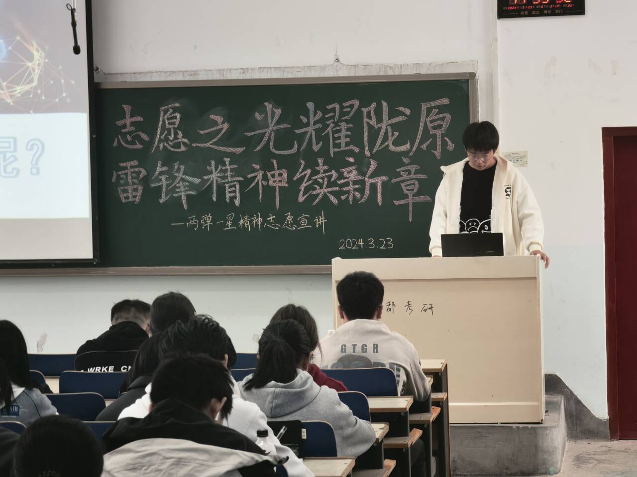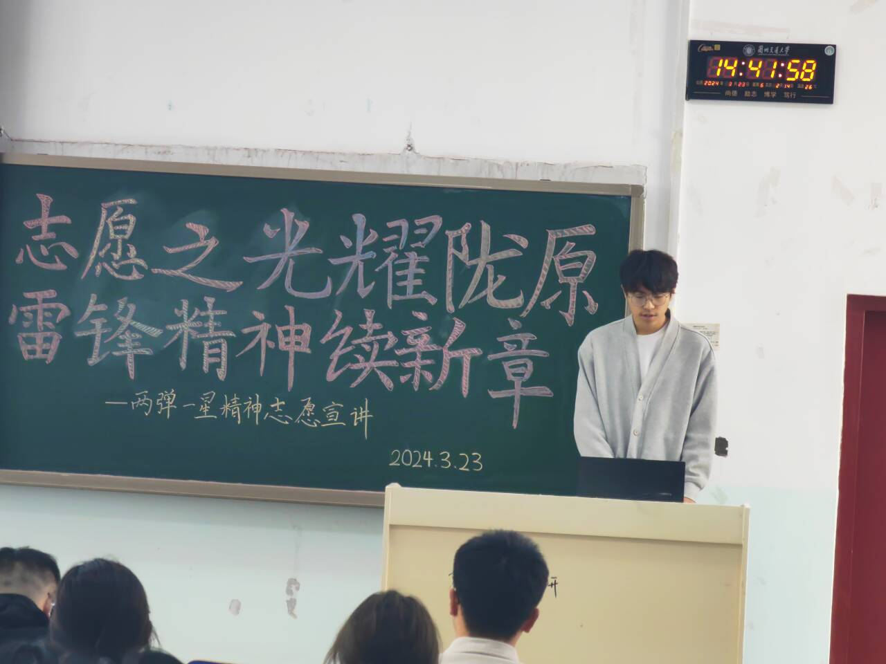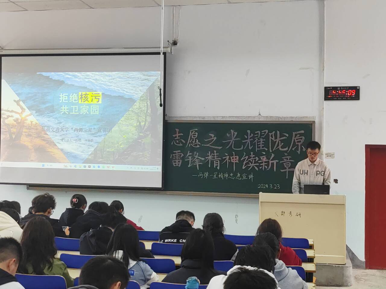 “两弹一星”精神,凝聚着爱国主义、集体主义、社会主义和科学精神,是中华民族精神的集中体现和进一步发展,是激励中华儿女不断开辟新征程、开创新未来的强大精神动力。为传承发扬“两弹一星”精神,引导广大青年热爱祖国、勤奋学习、勇于创新、实学实干,3月23日,机电工程学院青年志愿者协会以“学习雷锋精神,凝聚奋进力量”为主题,面向交通运输学院、环境与市政工程学院、文学院、土木工程学院、自动化与电气工程学院、建筑与城市规划学院的青年志愿者们开展了“两弹一星”精神志愿宣讲活动。机电工程学院青年志愿者郭岩、赵力锐和付新担任了主讲。