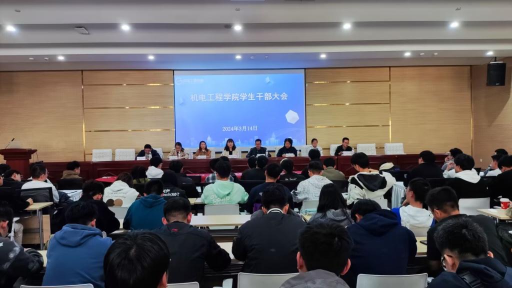 3月14日下午,机电工程学院在笃行楼五楼中翼报告厅召开了全院学生干部大会,学院党委副书记、副院长荀新文,各年级辅导员、各班级班长、团支书、副班长防电诈宣传员学生会干部参加了会议,会议由学生工作办公室主任张晓丽主持。