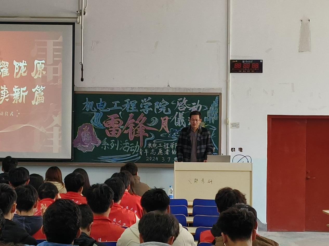 阳春三月神州地,雷锋之火永不息。为深入学习贯彻习近平总书记关于学雷锋志愿服务工作的重要指示精神,深刻把握雷锋精神的时代内涵和实践要求,大力弘扬“奉献、友爱、互助、进步”的志愿精神,3月7日,机电工程学院在7教1801教室举办了学雷锋青年志愿服务月启动仪式。学院党委副书记、副院长荀新文,辅导员孟玲,学院青年志愿者以及各班级团支书参加了活动。