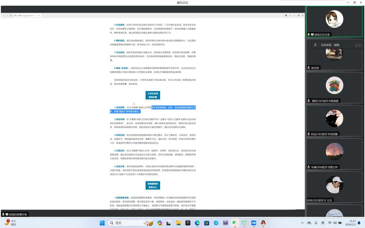 会上,胡瑶老师从工作原则、实践内容、信息获取渠道、报名方式、总结反馈、激励机制等几个方面对寒假“返家乡”社会实践进行了解读,要求全体团支书会后通过主题团日、总结分享会等形式在团支部内做好宣传动员,调动团支部积极性,广泛动员大学生以乡情为纽带积极参与活动,扩大实践活动的实效性和影响力。她希望大家结合大学生社区实践计划相关工作安排,结合专业特色和个人特长,因地制宜开展“返家乡”实践活动,增强社会化能力,以实际行动回报家乡、服务人民。最后,胡瑶老师就近期的专题组织生活会、“团支部”对标定级等工作做了安排部署。