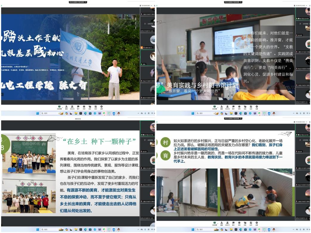 会议邀请荣获2023级全国“三下乡”社会实践优秀个人的陈文智同学做经验分享。陈文智同学分享了他在历年“返家乡”社会实践活动中的所见所闻,以及他所参与的“乡村图书馆”和“乡村美育”计划。他说道:参加“返家乡”社会实践活动,返回家乡,深入基层,了解民情,服务人民,回到自己那片熟悉的土地,通过亲身实践,慢慢领悟,明白了“返家乡”不仅仅是社会实践活动,更是我们反哺家乡初心的一步。”他用自己的切身经历鼓励青年脚踏沃土作贡献,扎根基层践初心,用真情放飞梦想,用热爱拨撒希望。