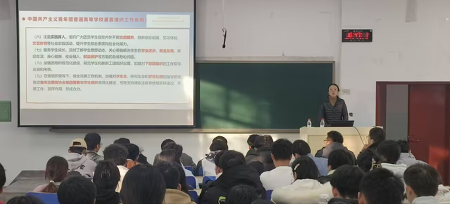 会上,学院团委书记胡瑶老师领学了《中国共产主义青年团普通高等学校基层组织工作条例》,重点学习了高校团委、院(系)级单位团组织的主要职责。她希望,全体学生干部要贯彻落实条例要求,结合学院工作实际,建好建强团学组织,引导团员青年成长为有理想、敢担当、能吃苦、肯奋斗的新时代好青年。之后,胡瑶老师就工作群的建立与撤销、新闻稿撰写的注意事项、各项材料的填写要求、活动策划书与报备表撰写要求、活动通知的规范性、活动组织过程中的注意细节、组织内部的沟通以及工作内容的反馈等具体问题提出了改进意见和具体要求,希望学生干部严格要求自己,做好自己的本职工作;随后,胡瑶老师对近期的学院迎新晚会具体工作及注意事项进行了详细的安排部署,希望全体学生干部各司其职,团结协作,认真筹备迎新晚会各项事宜。最后,胡瑶老师寄语学生干部,要树立远大理想,勇于砥砺奋斗,勇担时代责任,努力做一个让人放心的人,“路虽远行则将至,事虽难做则必成。”