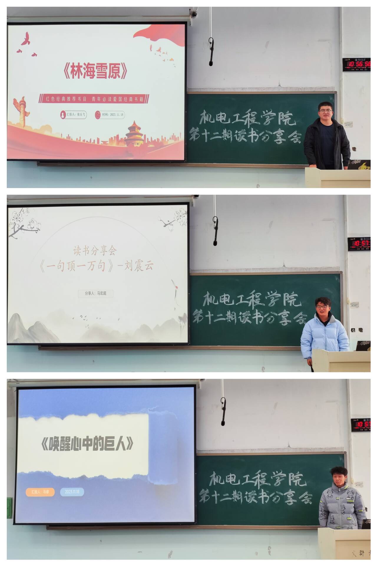 张乐飞同学分享的《林海雪原》讲述了一支骁勇善战的人民解放军小分队,在团参谋长少剑波的率领下,深入林海雪原,与盘踞在东北地区的土匪势力展开激战的故事。小分队在极端艰苦的条件下,克服重重困难,凭着坚定的信念和机智勇敢的精神,最终战胜匪帮,为东北人民的解放事业立下了赫赫战功,不仅展现了解放军的英勇事迹,也展现了中国共产党领导下的新中国,一路走来的艰辛与辉煌。马宏超同学分享的《一句顶一万句》通过一个家庭的故事,展现了中国改革开放以来社会发展变迁的历程,以孤独者的生存状态为背景,展示出了一系列小人物的内心世界。故事看似简单,但回味悠长,一去一来,延宕百年,反映出了中国社会底层群众的生活需求和梦想追求;马睿同学分享的《唤醒心中的巨人》是一本引人深思的励志书籍,作者通过引人入胜的故事、真实的案例和生动的语言,帮助读者了解自身潜在的能力,提供了实用工具来激发个人动力和创造力,帮助读者克服困难,实现梦想,创造出更有意义的生活。