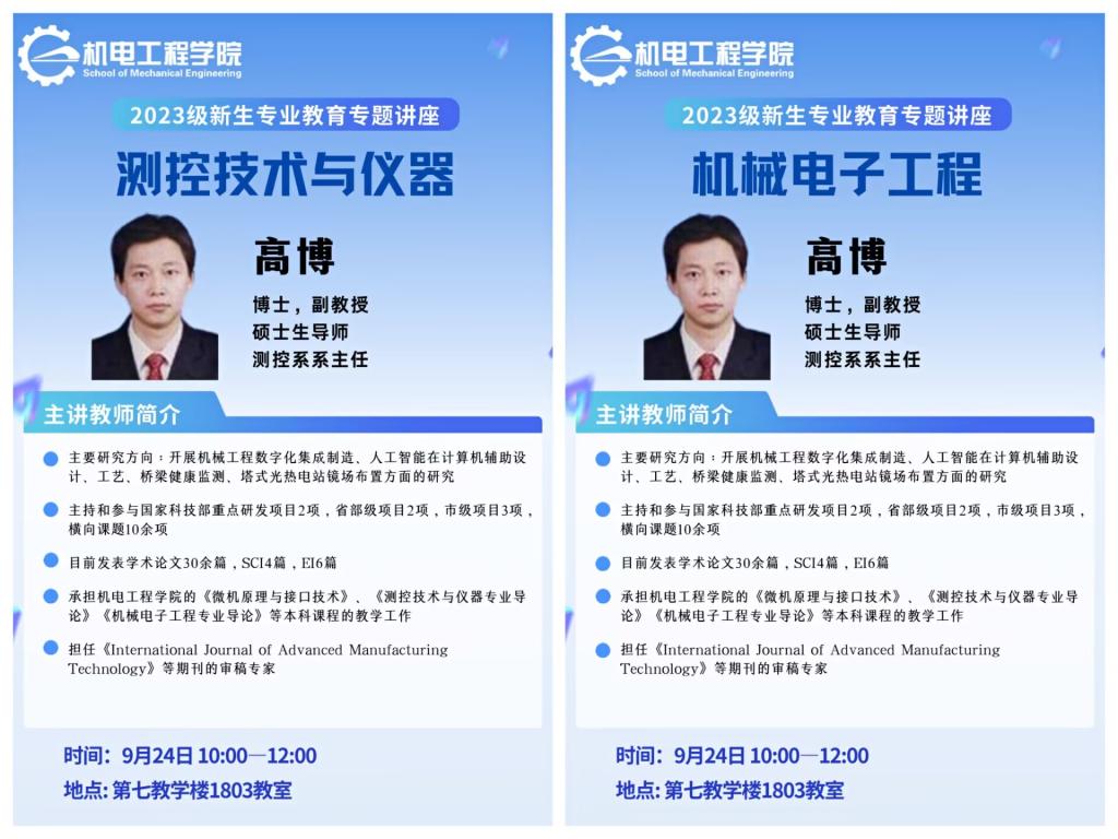 为帮助2023级新生了解学校、学院和专业的培养目标,树立正确的学业态度和专业思维,合理规划未来四年的学业生涯,机电工程学院新生专业教育专题讲座正式启动。9月24日上午10:00,测控技术与仪器系主任高博面向测控技术与仪器和机械电子工程专业新生在七教1803教室进行了专业教育宣讲,测控技术与仪器和机械电子工程专业全体新生倾听了讲座。讲座由2023级辅导员王小义主持。