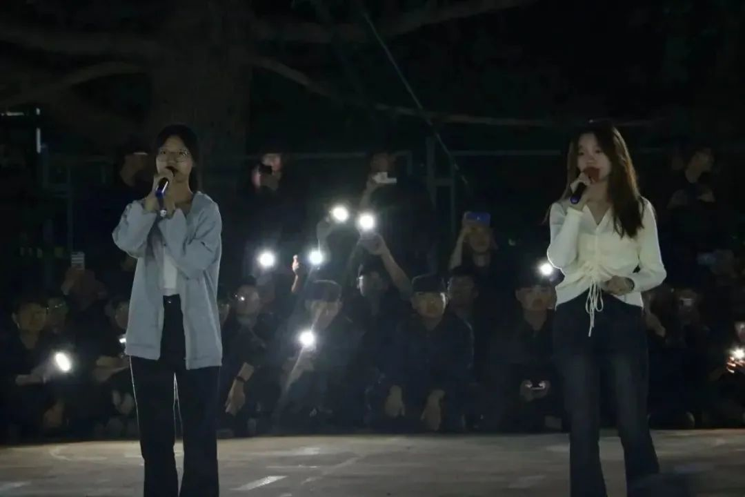 在演出过程中,百名新生用手机打光,在夜幕下用热情与激情,为学长学姐搭建起了青春的舞台。在这个舞台上,青春的朝气映射出学长学姐的绚丽风采,也照亮了新生们的大学生活。
