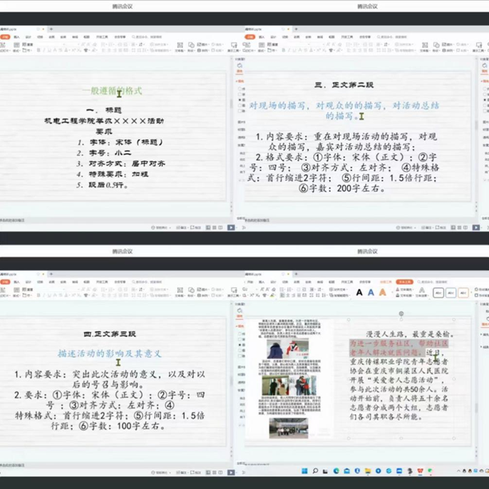 随后,胡文博学长从宣传文稿内容注意事项以及文稿撰写两个方面切入,对学院团学活动的新闻稿撰写进行了详细讲解,并以一篇新闻稿为例为大家详细分析了新闻采写基本知识以及新闻稿写作的注意事项,希望大家要勤于思考,勤加练习,要善于把握活动的方向,准确提炼活动目的,注重宣传的时效性。与会人员不仅学习到了新闻推送内容的写作思路和整体构成,也认识到了作为学院团学工作者应有的责任和担当。