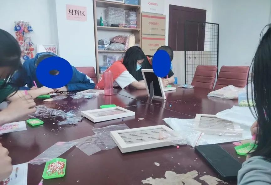 在基地老师的引领下,志愿者们与学员共同完成手工制作——钻石画。志愿者们修缮玻璃,固定螺丝,激情洋溢,很快便完成活动前的准备。活动中,志愿者们与基地残障人士齐心协力,共同协作完成了“万柿如意”、“心想事橙”等手工钻石画。带着美好寓意的钻石画在残障人士和志愿者们的手中闪闪发光。