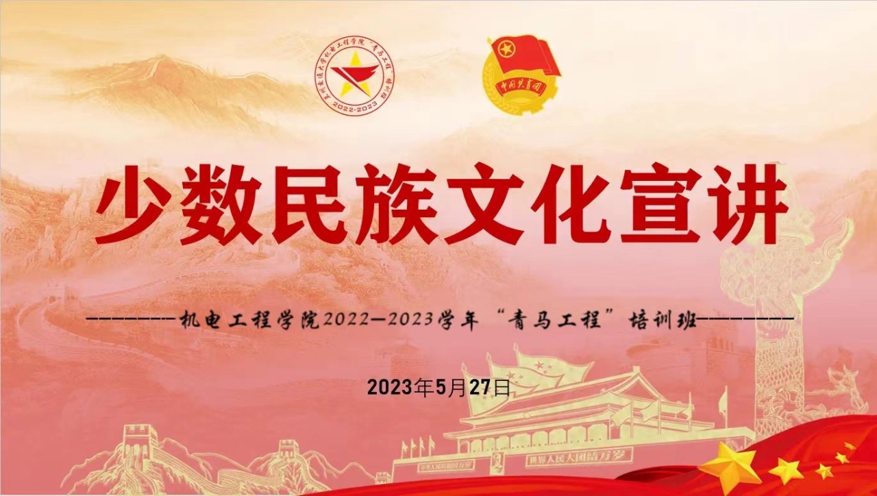 2023年5月,是第41个民族团结教育月。民族团结是各民族共同繁荣的前提,是祖国统一的基础。为深入学习贯彻习近平新时代中国特色社会主义思想,弘扬民族团结主旋律,传播民族团结正能量,活跃校园文化气氛。2023年5月27日,机电工程学院团委组织院“青马工程”培训班学员开展了“少数民族文化宣讲会”,培训班共计40余人参与本次宣讲会。