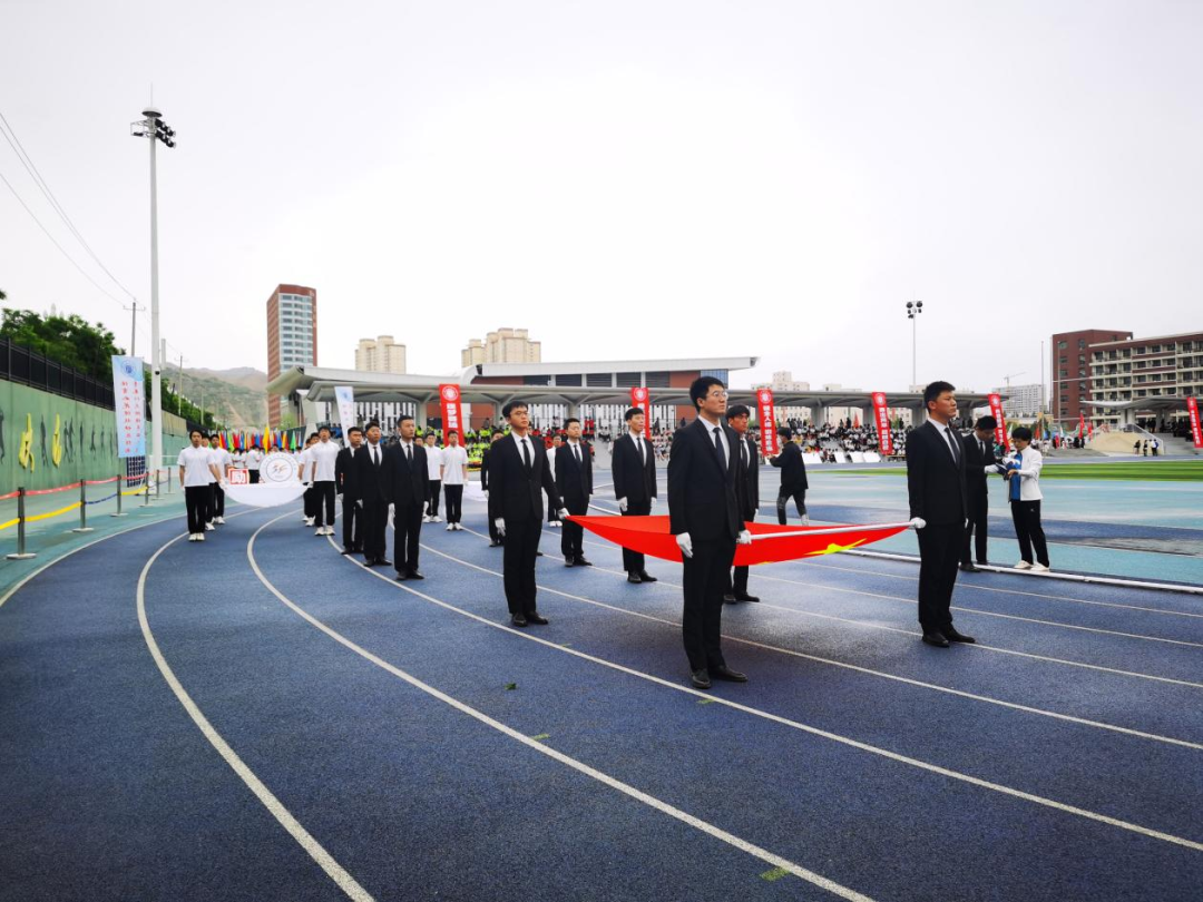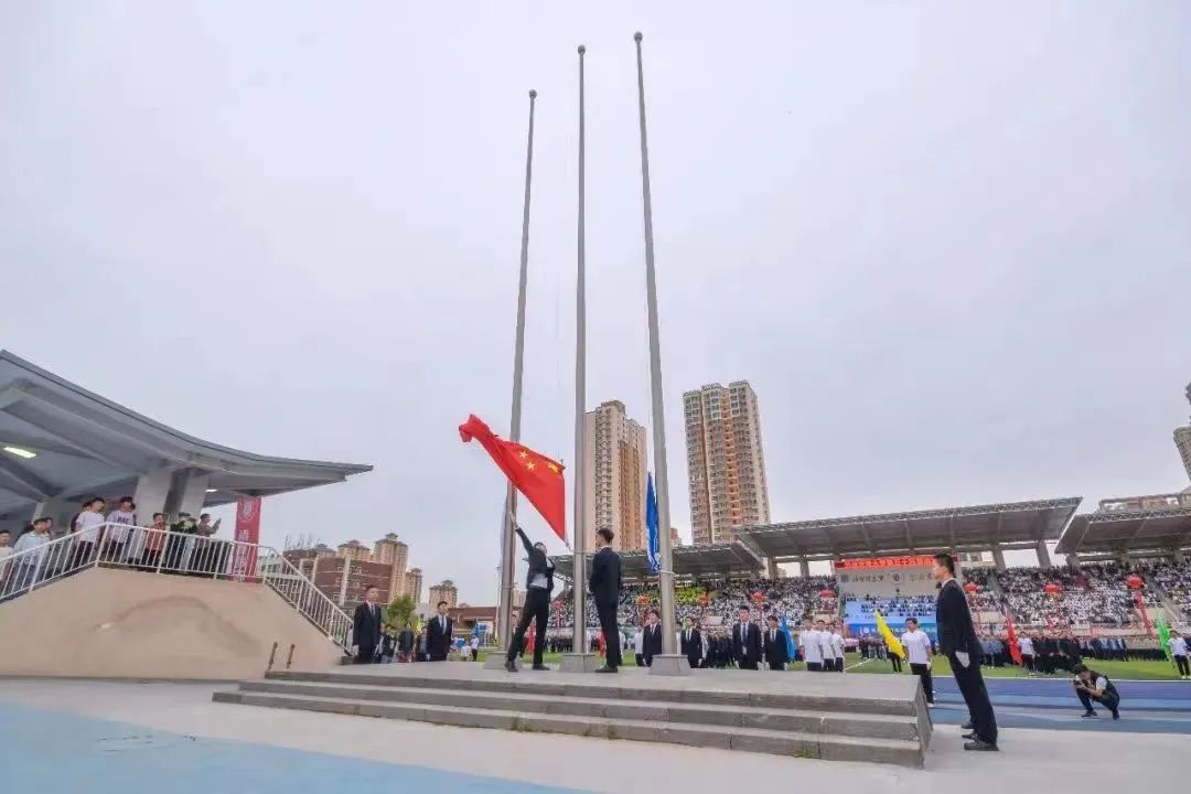 上午8时,开幕式正式开始,由机电青年组成的国旗护卫队手持五星红旗站在队伍最前列,他们紧卡乐点,踏着正步,在雷鸣般的掌声与欢呼声中走过主席台,前往国旗台执行升旗任务。