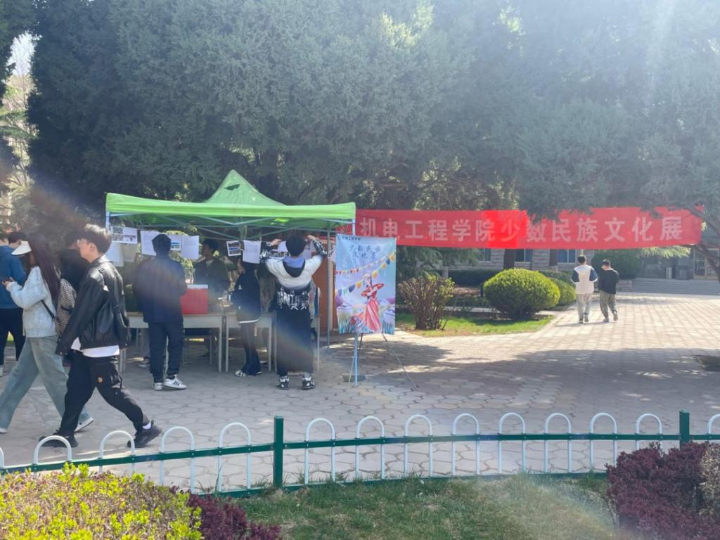 习近平总书记强调,民族团结是我国各族人民的生命线,中华民族共同体意识是民族团结之本。为深入开展民族团结进步宣传教育工作,引导广大青年认知传统、尊重传统、继承传统、弘扬传统,推动中华优秀传统文化传承创新,促进各民族交往交流交融,凝心聚力铸牢中华民族共同体意识,2022年4月15日至4月16日,机电工程学院团委在图书馆前广场举办“少数民族文化展”。