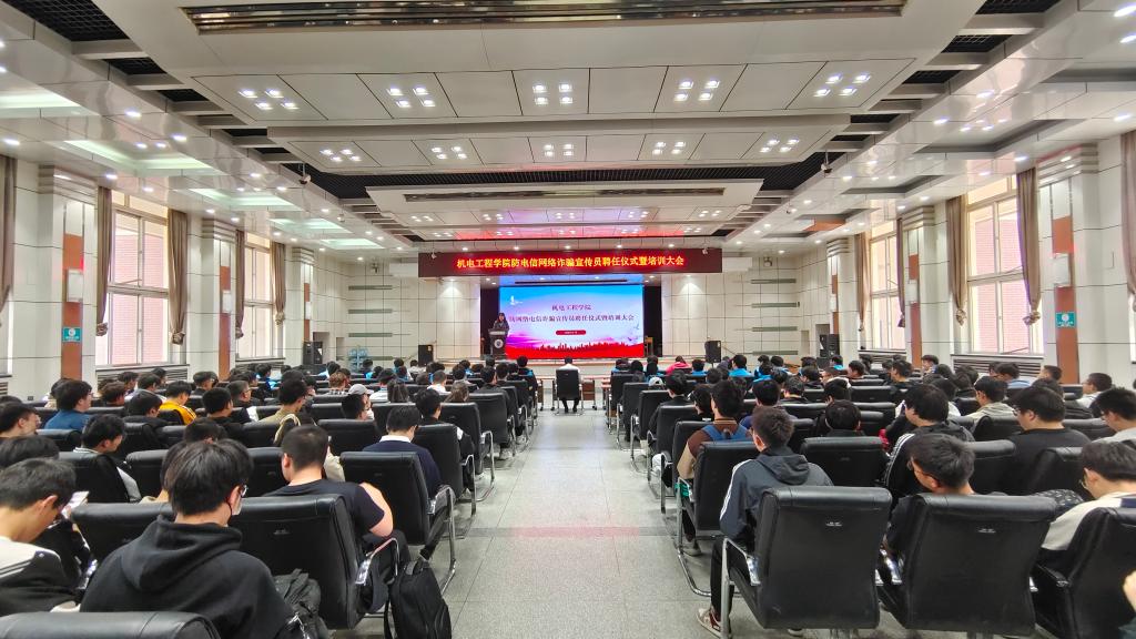 在第八个全民国家安全教育日到来之际,为了进一步做好校园防范电信网络诈骗工作,营造校园防范电信网络诈骗宣传教育氛围,提高我院学生的防骗识骗能力,预防和减少电信网络诈骗案件的发生,4月14日中午,机电工程学院在五教翠英厅举行了防电信网络诈骗宣传员聘任仪式暨培训大会,安宁西路派出所警官张新颖、马海清,学院党委副书记、副院长荀新文,辅导员吴东亮、李鹏浩、李亚娜、符世文以及学生干部参加了活动。会议由学生工作办公室主任张晓丽主持。