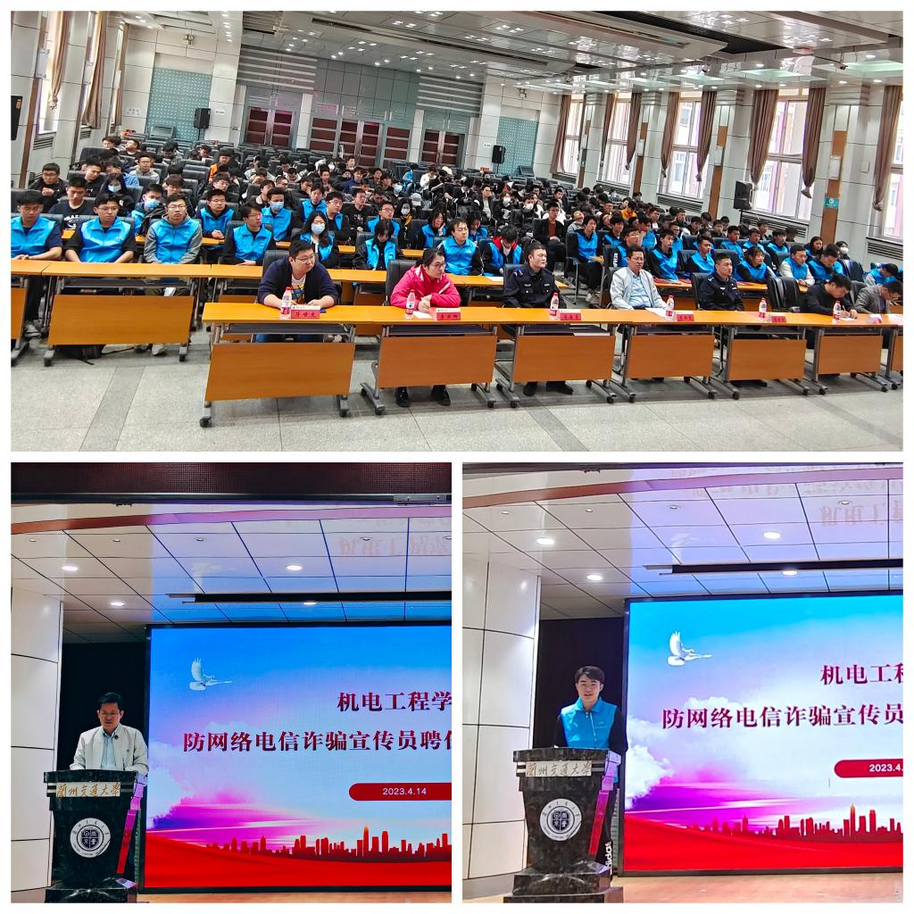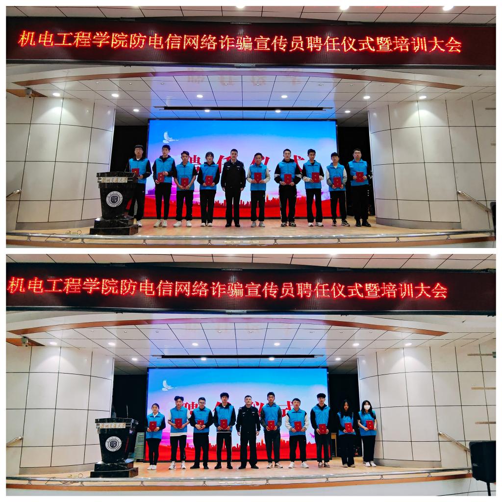 学生工作办公室主任张晓丽宣读了机电工程学院防电信网络诈骗宣传员聘任文件,与会嘉宾颁发了聘书;共同观看了防电诈视频;发放了防电诈和反恐宣传材料;受聘的宣传员代表宣读了《机电工程学院防电信网络诈骗倡议书》;受聘学生们纷纷表示,一定要当好反诈宣传员、保护员和倡导员,努力提高防范电信网络诈骗意识和能力,为建设无诈安全校园贡献力量。