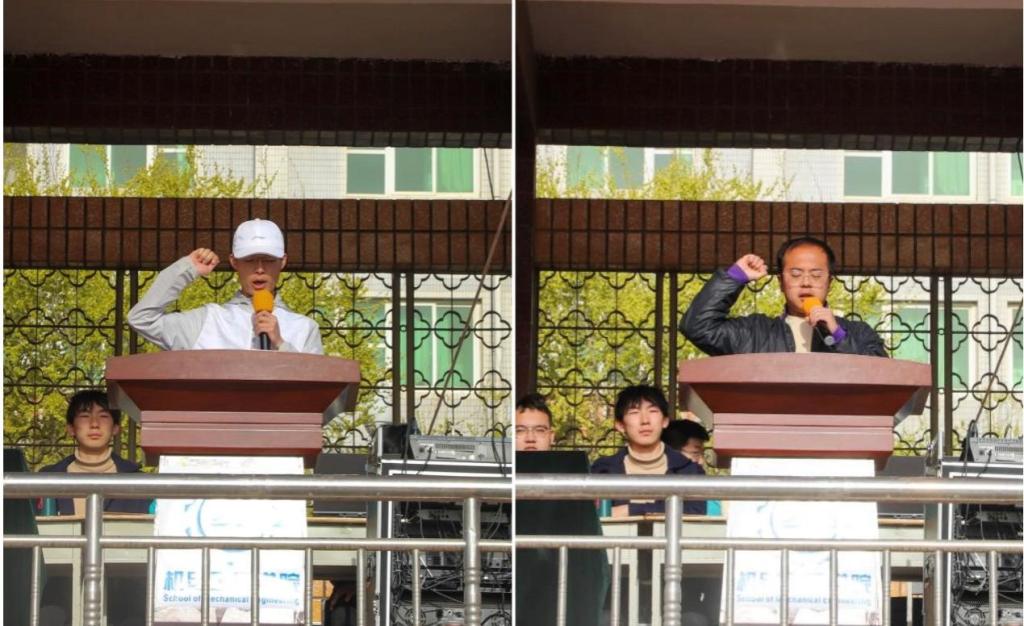 裁判员代表房斌同学和运动员代表郝兆安同学依次宣誓后,机电工程学院第54届春季大学生田径运动会比赛正式开始。