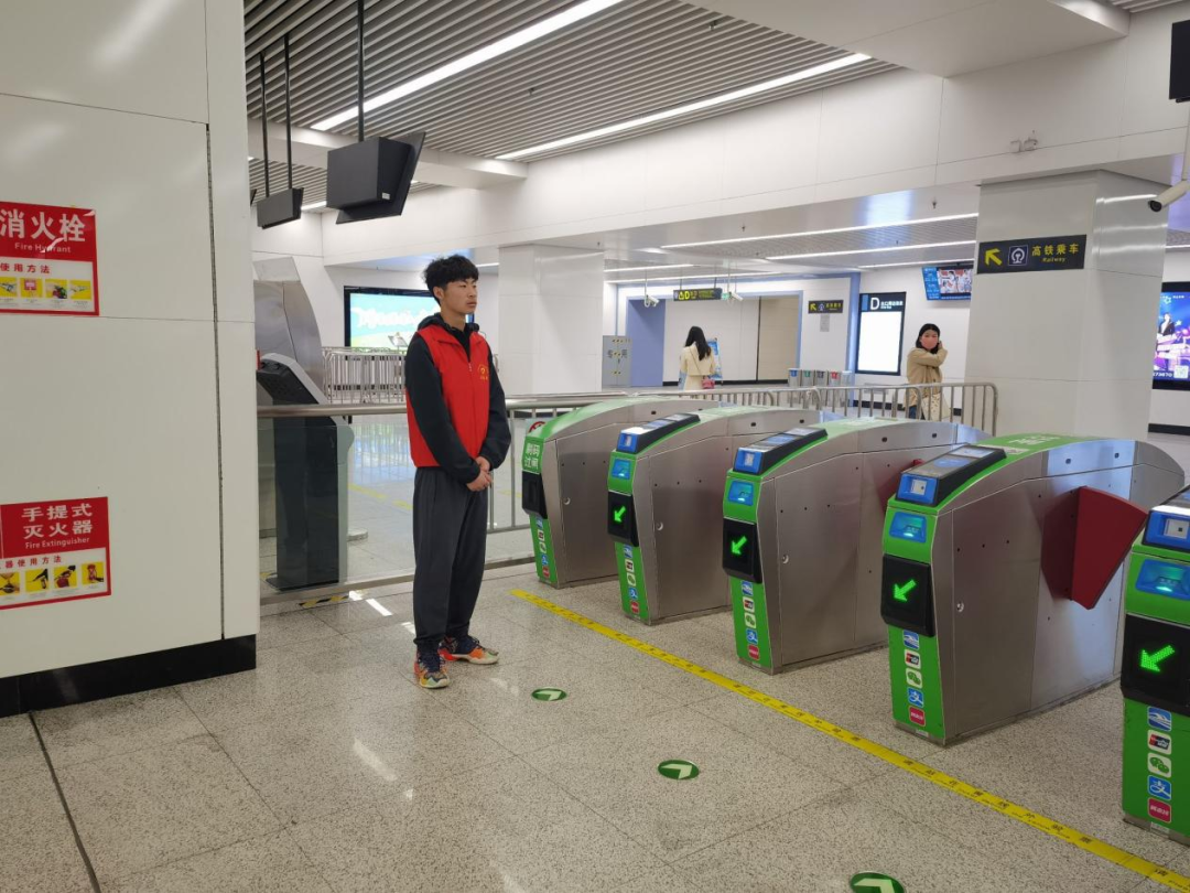 活动开始前全体志愿者在车站指挥室前集合拍照,负责人分配具体工作并讲解各个岗位的注意事项和要求。随后,志愿者们身穿红色的志愿马甲开始了自己的工作,有的志愿者负责维持乘车秩序,有的志愿者负责在入口处帮助乘客解决问题……志愿者们分工明确,团结协作,在短短的三个小时里,帮助了行动不便的老年旅客,帮助了着急赶车的旅客朋友,帮助了独自乘车的小朋友们,不仅为地铁的安全运行助力,同时也守护了乘客的生命安全与财产安全为他们指引路标。