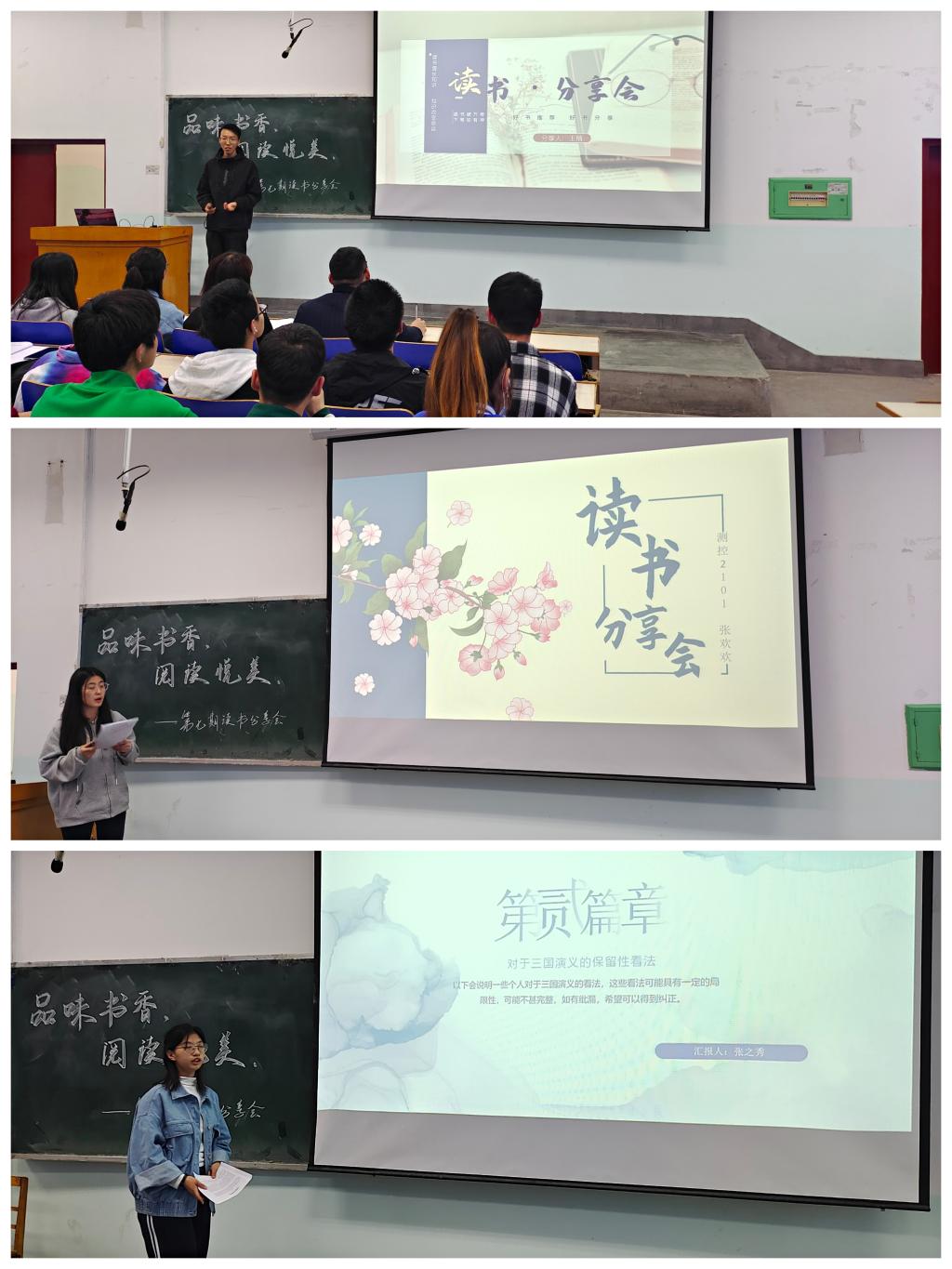 三位分享同学与大家分享了自己的读书经历和阅读体验,《三国演义》这部古典巨著,是中国几千年沉淀下来的精华,是我们的文化瑰宝。在张之秀同学的讲述中,我们像是穿越了时空,来到了那个群雄逐鹿、战火纷飞的三国时代。风云变幻、刀光剑影、文争武斗、英杰辈出、三国鼎立、终归于晋,激烈动荡之后,那一幅幅荡人心弦的画面凝固远去,成为历史的瞬间,这个时代,是五千多年中华文明中短暂的一瞬,却又是让人心驰神往的精彩一幕;王楠同学讲述的《人间词话》让我们体悟了王国维先生所说古今之成大事业、大学问者,罔不经过三种之境界,第一境界,孤独地为理想奋斗,叫作“厚积”阶段;第二境界,拥有坚持不懈的毅力,叫作经历“阶段”;第三境界,成功后的豁然醒悟,叫做“新生”阶段;面对成功后 我们幡然领会:幸福就在身边,我们要的不过就是一壶酒、一卷书、一首诗,清风、明月、夕阳,爱人、儿女、知己;张欢欢同学的分享的《活着》一书,讲述了一个小人物在巨变的历史中沉浮,完全不能掌握自己的命运,不幸和坎坷总是缠绕着他,然而他从没有放弃活下去的信念,始终对生活充满热情,这也让我们明白了人生最曼妙的风景,其是内心的淡定与从容;我们不必如此期盼外界的认可,要知道,世界是属于我们自己的,每个人都要好好的活着。