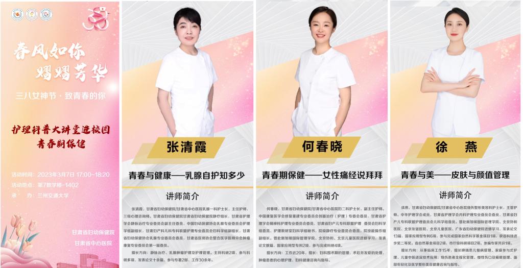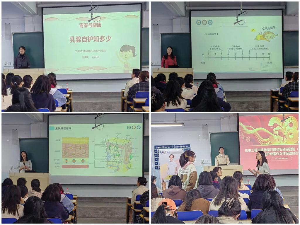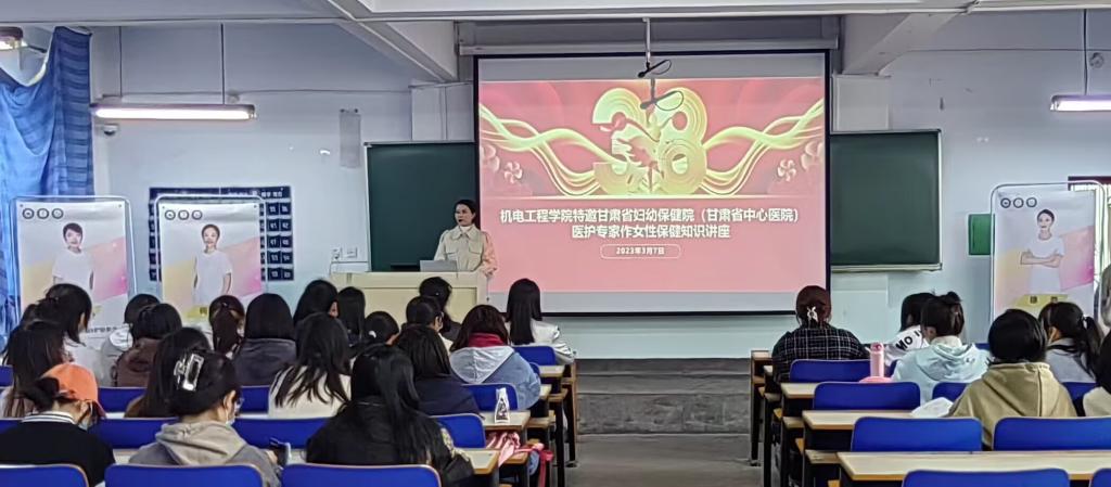 “三八”国际妇女节来临之际,为进一步提高学院女生自我保健意识及疾病预防能力,促进学生身心健康发展,3月7日下午5:00,机电工程学院特邀甘肃省妇幼保健院(甘肃省中心医院)张清霞、何春晓、徐燕三位医护专家在第7教学楼1402教室为我院女生作保健知识讲座,学院70余名女生聆听了讲座,讲座由学院辅导员孟玲主持。