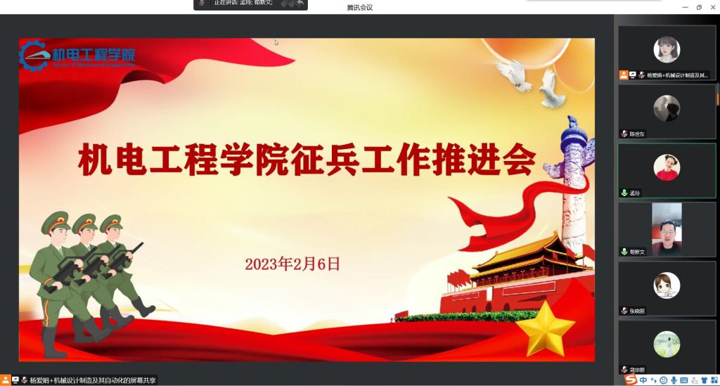 为了进一步做好学院2023年征兵工作,确保征兵工作有力推进,2月6日上午10:00,机电工程学院召开了征兵工作推进会。学院党委副书记、副院长荀新文,学生工作办公室主任张晓丽,团委书记胡瑶,全体辅导员参加了此次会议。