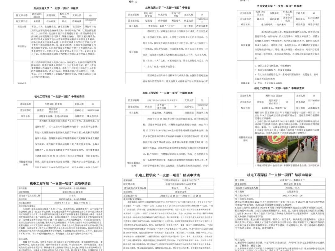 2022年,机电工程学院团委贯彻落实校团委《关于开展 2022 年度团支部活力提升工程“一支部一项目”申报工作的通知》要求,组织各团支部以“喜迎二十大、永远跟党走、奋进新征程”为主题,开展了兰州交通大学2022年度团支部活力提升工程“一支部一项目”工作。各团支部结合自身特点,自主设计和创建有影响力、长效性的品牌项目,项目持续推动实施活力提升工程,不断增强团组织对团员青年的吸引力和凝聚力。经过支部申报和学院审核,共完成“一支部一项目”立项56项,其中理论学习类32项,教育实践类10项,志愿服务类4项,文体艺术类10项。截至目前,所有项目已全部完成中期考核,并提交了结项审核资料。