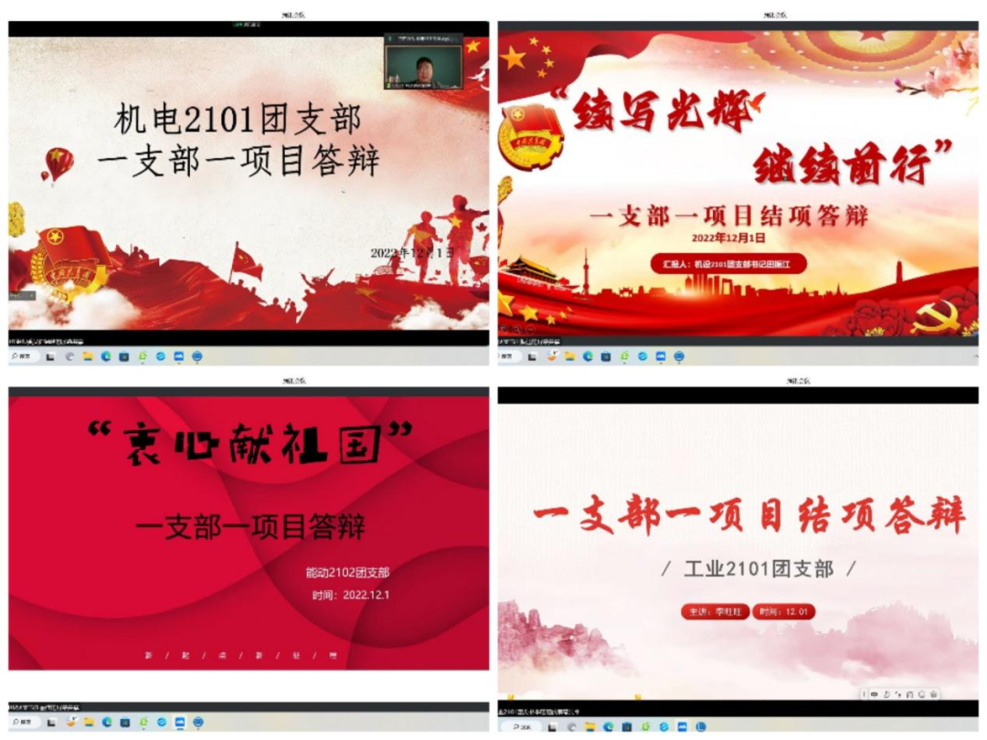 凝聚青春力量,团结筑梦未来。参与答辩的19个团支部以“班子建设好、团员管理好、活动开展好、制度落实好、作用发挥好”的“五好”培育目标为基准,紧扣团支部的核心工作,重点围绕“一支部一项目”项目实施过程,通过“PPT+视频”的方式从本支部班子建设、团员管理、“一支部一项目”活动开展等方面讲述支部故事,宣扬品牌特色,既全景展示了我院团支部整体风貌,又特景展示了团支部活力提升工程的突出方面和典型特色。此次“一支部一项目”结项答辩活动鼓励各支部积极创新,推进特色化建设,在不断学习探索中,丰富项目内涵,发挥各自特长,建成更多具有深远意义的开创性特色项目。