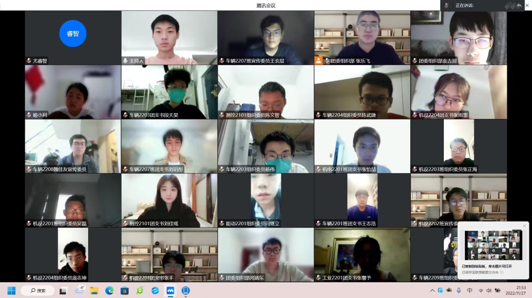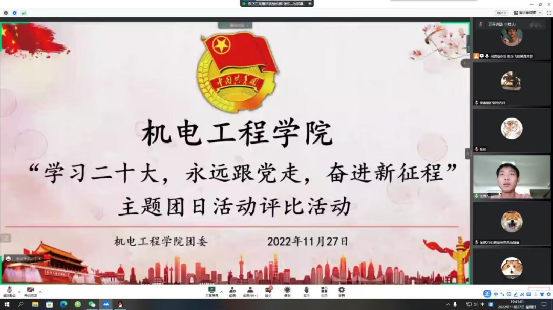 为充分发挥优秀团支部的典型示范作用,推动学院各团支部争优创先学习宣传贯彻党的二十大精神,团结引领广大团员青年深入学习党的二十大精神要义,自觉把个人奋斗融入党和人民的事业当中,为全面建设社会主义现代化国家、全面推进中华民族伟大复兴而团结奋斗。2022年11月27日19:30,机电工程学院团委线上举行了“学习二十大、永远跟党走、奋进新征程”主题团日评选活动。学院团委书记胡瑶、主要团学干部,学院2021级、2022级全体团干部共计110余人参加了此次评选活动。