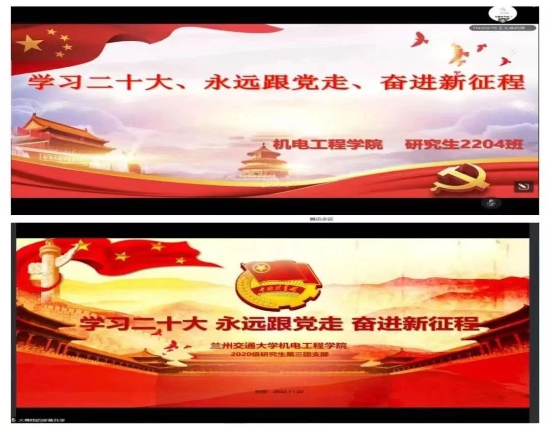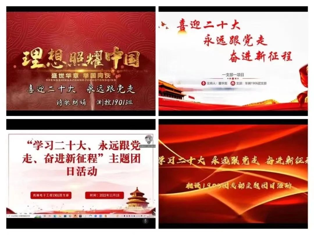 中国共产党第二十次全国代表大会是在全党全国各族人民迈上全面建设社会主义现代化国家新征程、向第二个百年奋斗目标进军的关键时刻召开的一次十分重要的大会。为深入学习宣传贯彻党的二十大精神,引导广大团员青年深刻领会和把握大会的精神实质和丰富内涵,切实把行动和思想统一到党的二十大精神上来,深刻领会奋进中国式现代化新征程的青年责任担当,近期,机电工程学院团委组织各团支部线上集中开展了“学习二十大 永远跟党走 奋进新征程”主题团日活动。