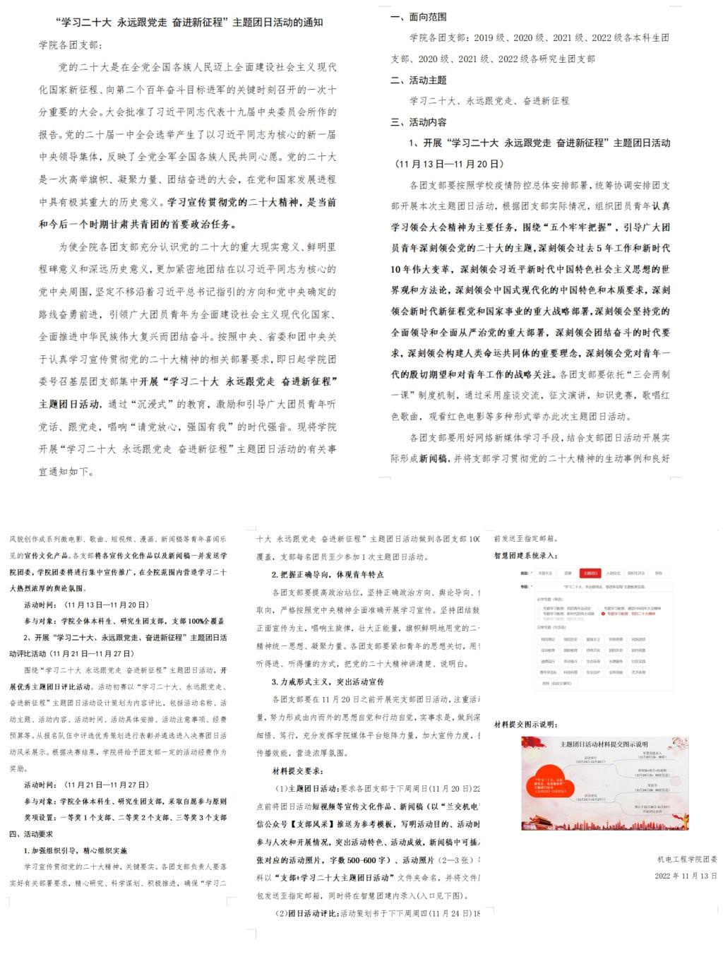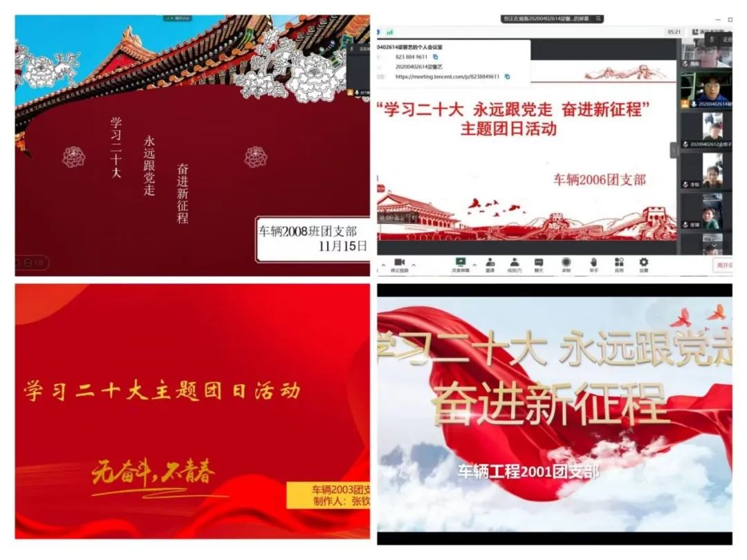 自11月13日至11月20日,学院87个团支部积极响应,有条不紊地围绕“学习二十大 永远跟党走 奋进新征程”主题开展团日活动。各团支部充分依托“三会两制一课”制度机制,组织团员青年通过积极收听收看党的二十大开幕会直播、热议二十大报告、召开二十大精神学习交流会、开展党的二十大知识竞赛、歌唱红色歌曲,观看红色电影等多种形式举办此次主题团日活动,扎实推进学习党的二十大精神在广大青年学生中走深走实,引导广大青年学子深刻领悟“两个确立”的决定性意义,增强“四个意识”,坚定“四个自信”,做到“两个维护”。