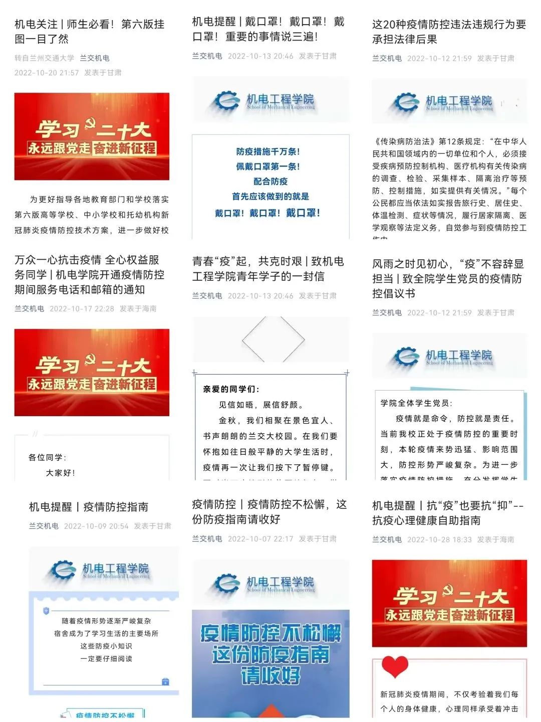 疫情期间,学院通过“兰交机电”微信公众号积极转载、推送、宣传防控知识、防范措施、注意事项和工作举措,广泛宣传新冠肺炎疫情防控知识,切实加强正面舆论引导,全方位做好疫情防控宣传工作,全力打好疫情防控宣传主动战。主动发声,正面引导,消除广大学生恐慌情绪,增强自我防疫意识,发布《致机电工程青年学子的一封信》《致全院学生党员的疫情防控倡议书》,引导广大学生坚持不信谣、不传谣,不转发未经官方确认的涉疫信息,自觉与负面舆论作斗争,做好自我防护,坚持完成每天核酸检测,按时完成每日线上课程任务,养成良好的生活习惯。发挥任课教师、班主任、学工人员力量,通过线上课堂、线上主题班会、专题教育活动等形式全方位加强教育引导,传达落实疫情防控工作部署,教育引导学生理解和支持学校防疫工作,严格遵守各项防疫规定,切实织密织牢疫情“防控网”。
