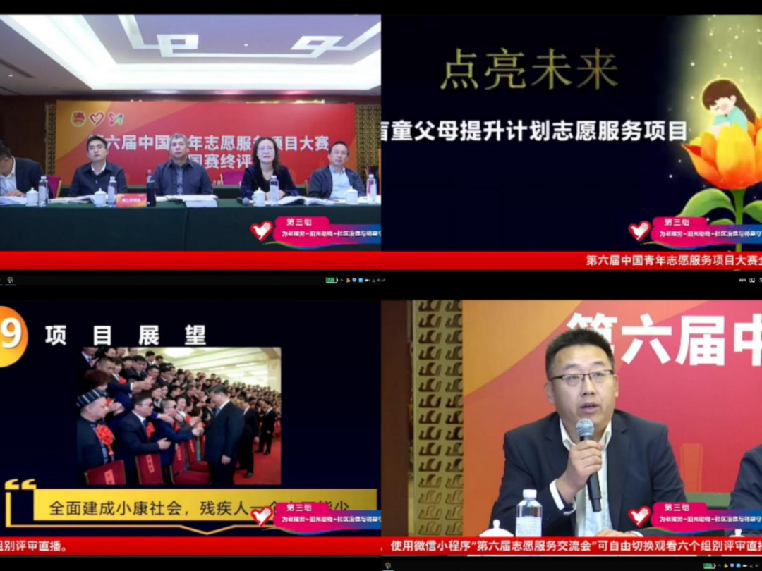 第六届中国青年志愿服务项目大赛全国赛终评于11月12日至13日在北京和山东济南举办。1000个项目入围全国赛终评。此次项目大赛涉及领域广泛,分为乡村振兴、文明实践、关爱少年儿童、为老服务等六个组别。此项赛会也是展示宣传优秀志愿服务项目,凝聚引领基层志愿服务组织的重要平台载体,全国的青年志愿者汇集云端,其中,排名前500的项目通过线上路演答辩。