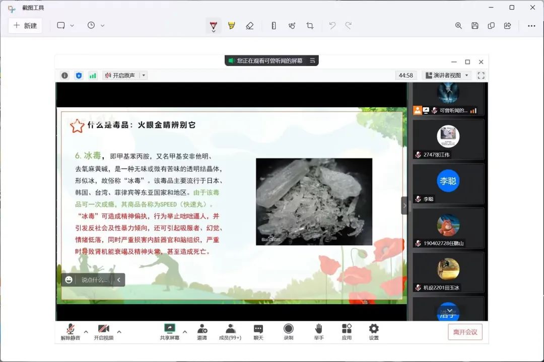 活动中,首先通过播放禁毒知识视频进行宣传教育,观看结束后,邀请了五位参赛同学围绕对毒品的认识、辨别以及对于如何抵制毒品方面进行了交流与分享,推动禁毒防毒的法制观念更加深入人心。其中,机设2201班的张之秀同学说道:“毒品是我们生活中很常见的死亡陷阱,通过这次学习,我也了解到了更多关于辨别毒品的方法,以后也会呼吁更多同学抵制毒品、远离毒品”。随后开展禁毒知识线上竞赛,竞赛题型以单选和多选题为主,内容涵盖我国禁毒工作方针、禁毒法律法规、毒品危害及防毒技巧等多个方面。此次竞赛活动坚持“学以致用,以赛促学,公平公正”的原则,最终评选出一等奖一人、二等奖两人、三等奖三人。
