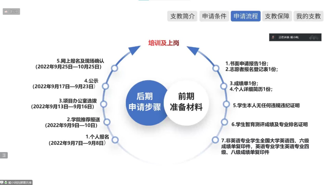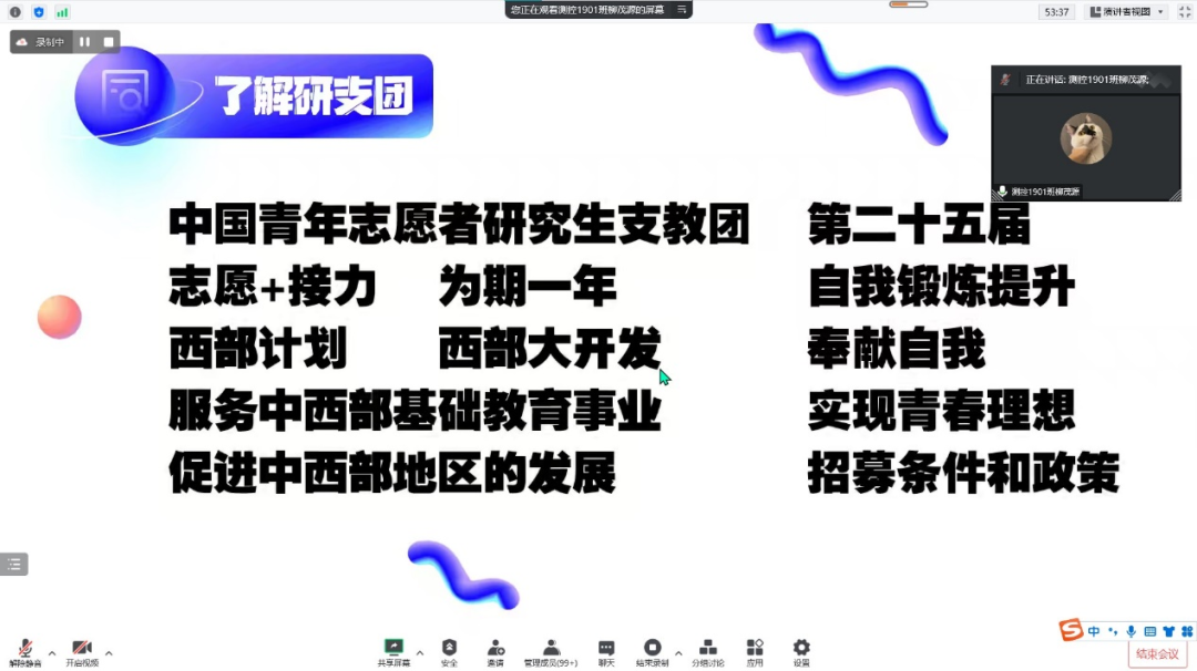 姬小利、柳茂源两位同学做了参加研究生支教团招募工作的经验分享。姬小利从支教简介、申请条件、申请流程、支教保障等四个方面详尽的分享了研究生支教团招募的全过程,以自身的支教缘由鼓励青年用一年不长的时间,做一件终生难忘的事。而柳茂源同学则是从自身实际出发,围绕“一了、二决、三急”讲述了自己在第25届研究生支教团招募过程中的经历,鼓励青年学子要满怀热情,以灼热的激情追寻自己所要追寻的。