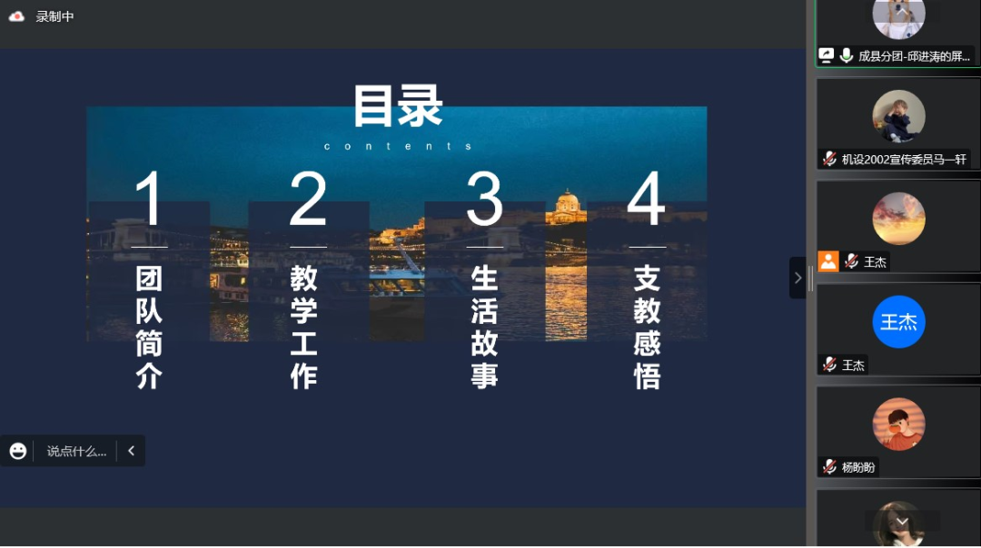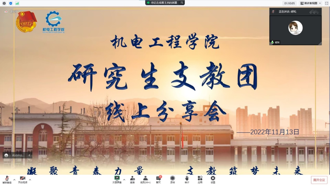 为帮助青年学生更好地了解“大学生志愿服务西部计划”,充分发挥“西部计划”志愿者活动的示范导向作用,积极引导青年学生立大志、明大德、成大才、担大任,鼓励青年学生把个人理想追求融入到党和国家的事业中,到西部去、到基层去、到祖国和人民最需要的地方发光发热。2022年11月13日,机电工程学院团委召开研究生支教团线上分享会,会议邀请了兰州交通大学第24届研究生支教团成员邱进涛、第25届研究生支教团成员姬小利、柳茂源对研究生支教团招募过程以及支教生活做分享交流,学院团委书记胡瑶、全体团学干部参加了此次会议。