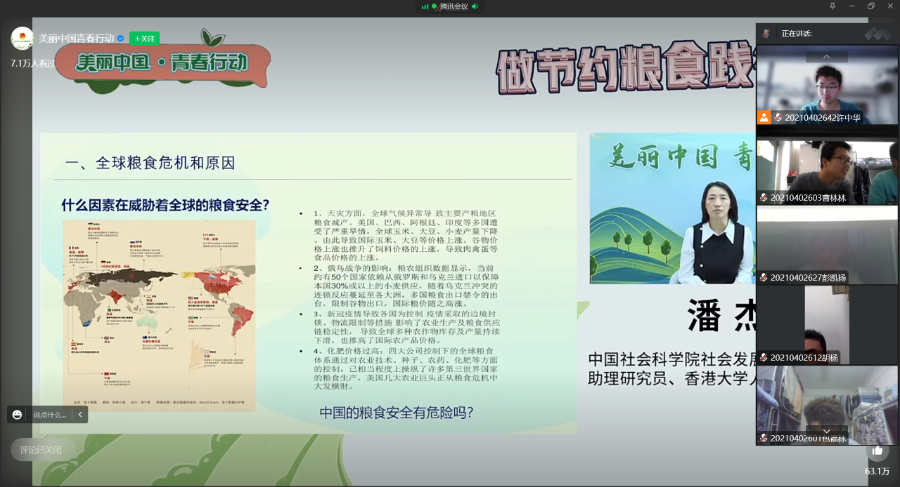 为深入学习贯彻党的二十大精神,倡导广大青年勤俭节约、珍惜粮食,成为节约粮食的践行者。2022年11月3日,共青团中央社会联络部邀请中国社会科学院社会发展战略研究院助理研究员,香港大学人类学专业博士潘杰老师为广大青年开展“做节约粮食践行者”线上公开课。