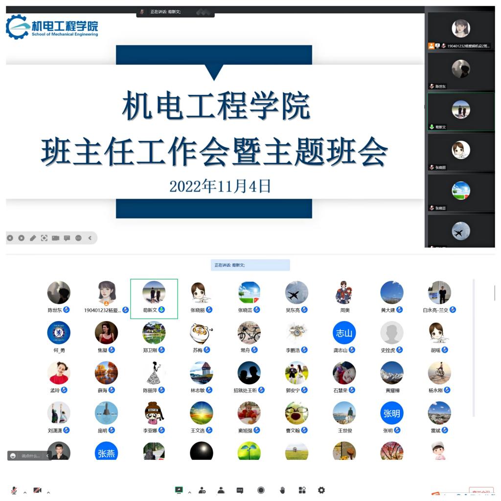 为进一步落实责任,坚决抓好疫情防控期间学生各项管理服务工作,11月4日19:00,机电工程学院通过腾讯会议召开了班主任线上工作会议,学生工作办公室主任张晓丽、全体班主任参加了此次会议,会议由学院党委副书记、副院长荀新文主持。会后各班陆续组织召开了主题班会。