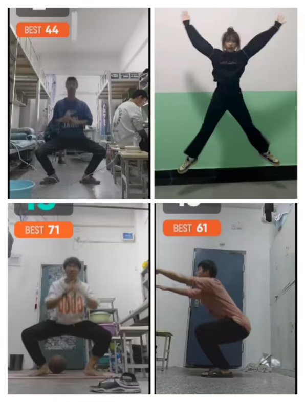 此次活动挑战项目分为男子组和女子组。女子组挑战项目为:一分钟深蹲,一分钟海星跳,一分钟开合跳;男子组挑战项目为:一分钟下蹲开合跳,一分钟深蹲,一分钟波比跳。活动项目的选取结合男女生差异选取,充分调动了大家“疫”起动的热情。疫情封控,虽然限制了同学们的活动范围,却无法阻止大家对运动的热情,活动共计130余名学生参加。为期7天的云端打卡活动,让沉闷的宿舍增添了许多乐趣,也成为了同学们在疫情期间调节身心、丰富课余生活的最佳方式。