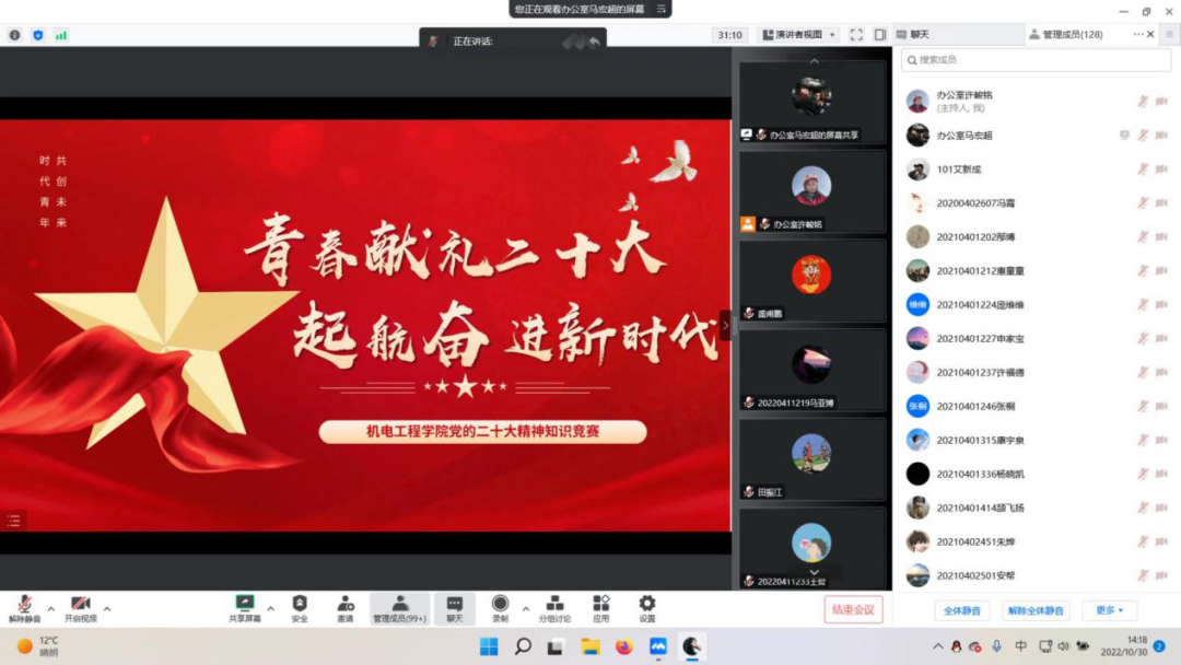 乘风破浪再出发,扬帆远航新征程。党的二十大是在全党全国各族人民迈上全面建设社会主义现代化国家新征程、向第二个百年奋斗目标进军的关键时刻召开的一次十分重要的大会。学习宣传贯彻党的二十大精神是当前和今后一个时期全党全国的首要政治任务。为引导团员青年深入学习宣传贯彻党的二十大精神,积极引导团员青年深刻领会和把握大会的精神实质和丰富内涵,切实把行动和思想统一到党的二十大精神上来,坚定理想信念,凝聚青春力量,自觉将人生目标同国家和民族的命运紧密相连,与祖国共进、与时代同行,2022年10月30日,机电工程学院学生会办公室举办了团员青年学习宣传贯彻党的二十大精神网络知识竞赛活动,本次活动共有120余名学生参加。