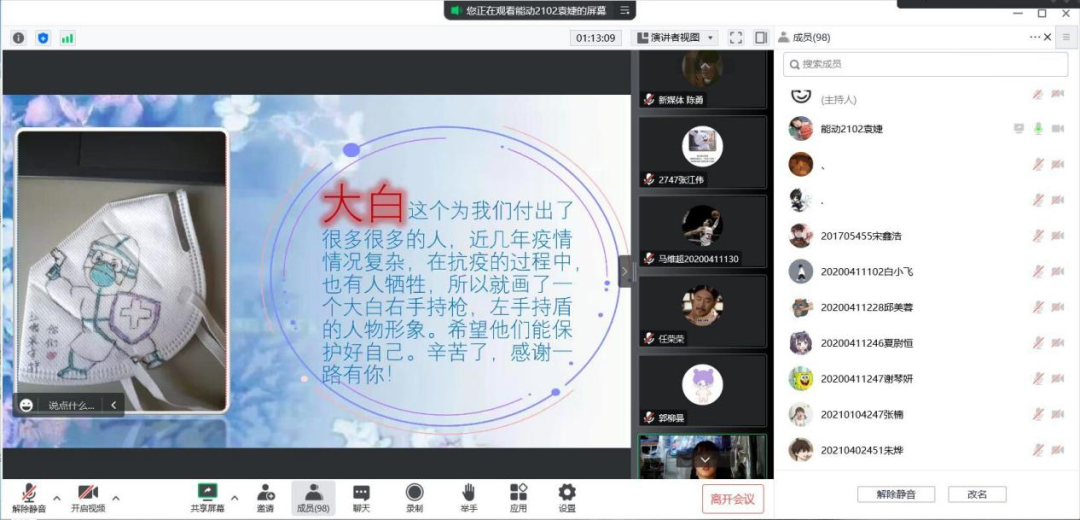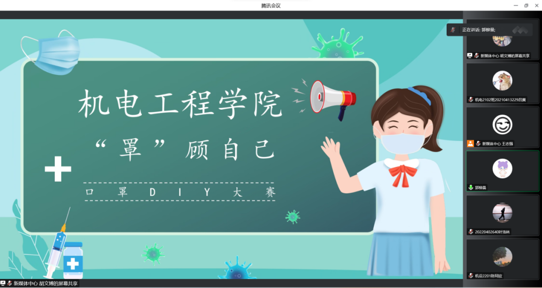 活动中,同学们积极响应,以个人或团队的形式踊跃报名,同学们围绕创作主题要求,认真思考,精心准备,用心创作,将随处可见的口罩变得不同寻常,一个个有趣而不失内涵的作品悄然诞生。经活动评委组对投稿作品初选,评选出10幅优秀作品进入线上PPT讲解环节,参赛选手按顺序依次进行作品展示,分享自己的创作灵感,创作过程以及创作寓意,疫情中的口罩在同学们的笔下被赋予了新的“温度”,同学们用一笔一画来致敬奋战在一线的工作人员们,展现青春的绚丽和奋发的精神。经过一个小时的精彩讲解,比赛也渐渐的接近了尾声。经过紧张的评比和打分之后,对10位优秀选手的获奖情况进行了公示,其中一等奖一名,二等奖两名,三等奖三名,优秀奖四名。
