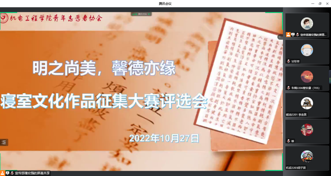 同学们热情高涨,百花齐放,以寝室或个人为单位,多形式投稿作品,展示寝室风采。通过线上投稿、线上初筛,累计收集到10副丰富多彩,别出心裁的作品进入线上作品展示与评选环节,评选会中,参赛选手积极准备,结合“摄影作品”、“寝室微视频创作”参赛作品诠释了作品背后包含的寓意,同学们以微电影、照片、标语设计等形式表现校园生活及社会热点,践行社会主义核心价值观,引导同学们发现正能量,传播正能量,展现新时代同学们的责任与担当。所有作品展示结束后,各位评委秉持公平公正公开的原则,进行了现场打分,最终评选出了一等奖一名,二等奖两名,三等奖三名。活动中,同学们用自己的方式表现了当代青年大学生面对疫情不害怕,不后退的坚强信念,展现了我院学生积极向上、热爱学习、热爱校园、热爱生活的良好面貌,营造了和谐美好、团结向上的寝室文化氛围。