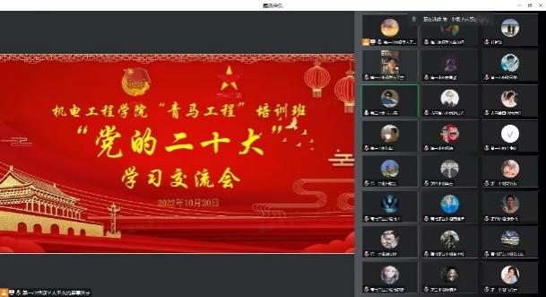 10月20日,机电工程学院团委组织2022-2023学年“青马工程”培训班学员在腾讯会议开展党的二十大精神专题学习交流会,围绕深入学习宣传贯彻党的二十大会议精神展开深入学习与热烈讨论。党的二十大报告深刻指出,青年强,则国家强。当代中国青年生逢其时,施展才干的舞台无比广阔,实现梦想的前景无比光明。会上,青马工程培训班各小组领学人、各小组学员代表分别进行了二十大精神学习的心得分享,大家表示一定认真学习、深刻领会报告精神,切实把思想和行动统一到报告精神上来,坚定不移听党话、跟党走,树立远大理想、努力刻苦学习、敢于斗争、艰苦奋斗、崇德向善,坚决履行“请党放心,强国有我”的铮铮誓言,努力成为担当民族复兴大任的时代新人!